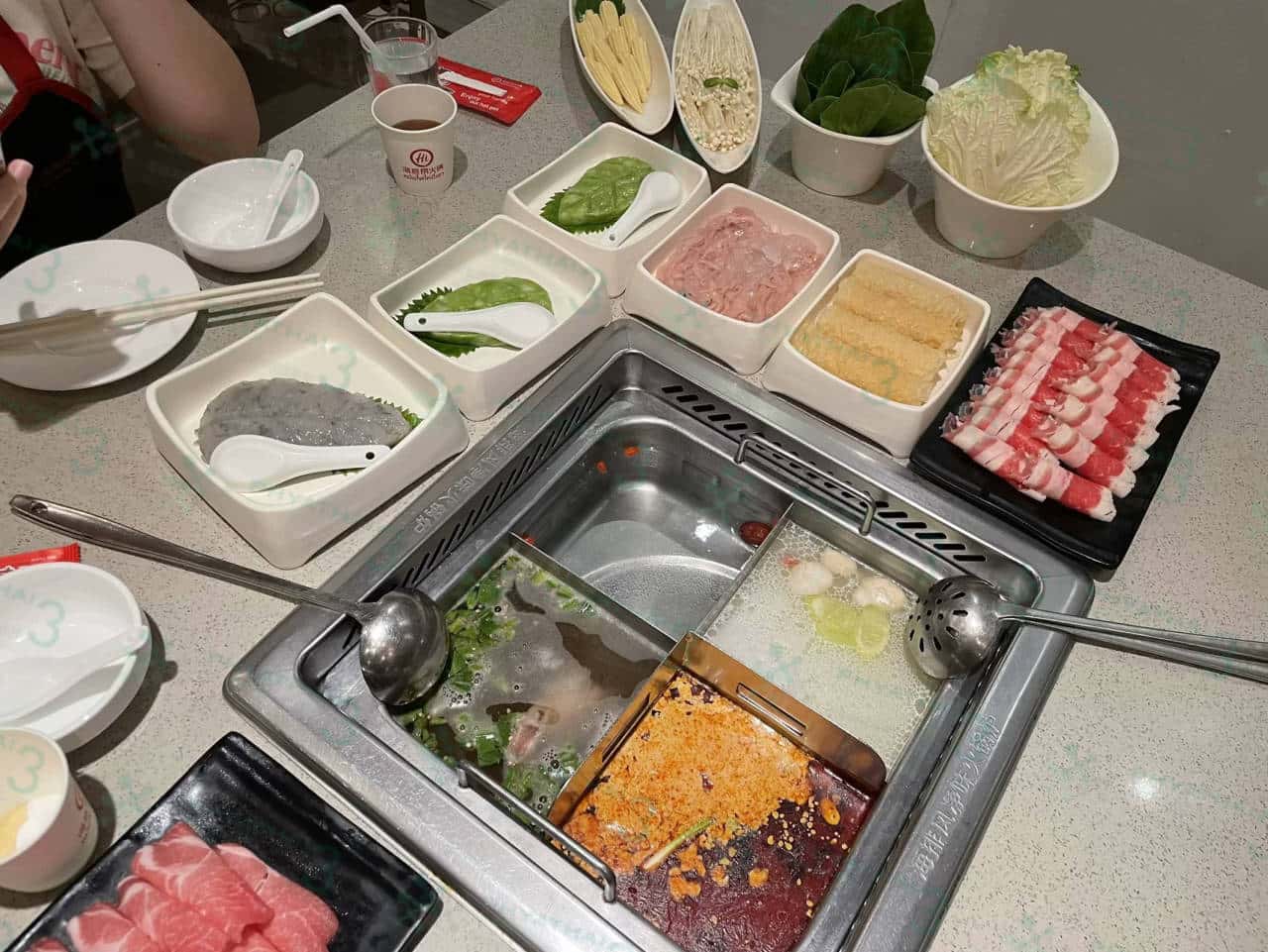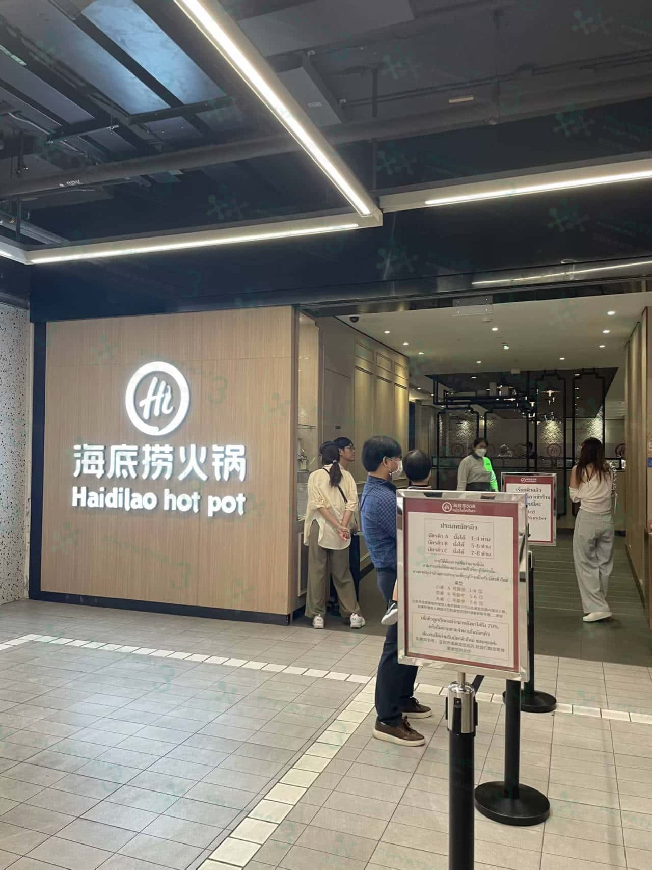【海底捞火锅】麻辣上瘾怎么错过这家店呢 到了泰国也有海底捞哦!泰国分店跟中国分店一模一样 ,首先第一个一样的就是 需要排队,但是排队久了不要担心无聊 。不管是美甲 按摩椅 擦鞋 游乐园 冰淇淋 饮料 饼干 水果都提供给客户打发时间哦。想吃就吃 想喝就喝 想玩就玩 我们今天等大概半个小时就可以进去了。我最爱的逃不过五花肉 还有虾滑太好吃啦。泰国海底捞还有一个秘密 如果我们跟服务员说“你们家的锅底很好喝” 服务员会帮我们把汤打包回家的,如果姐妹们来泰国海底捞可以试试一下噢