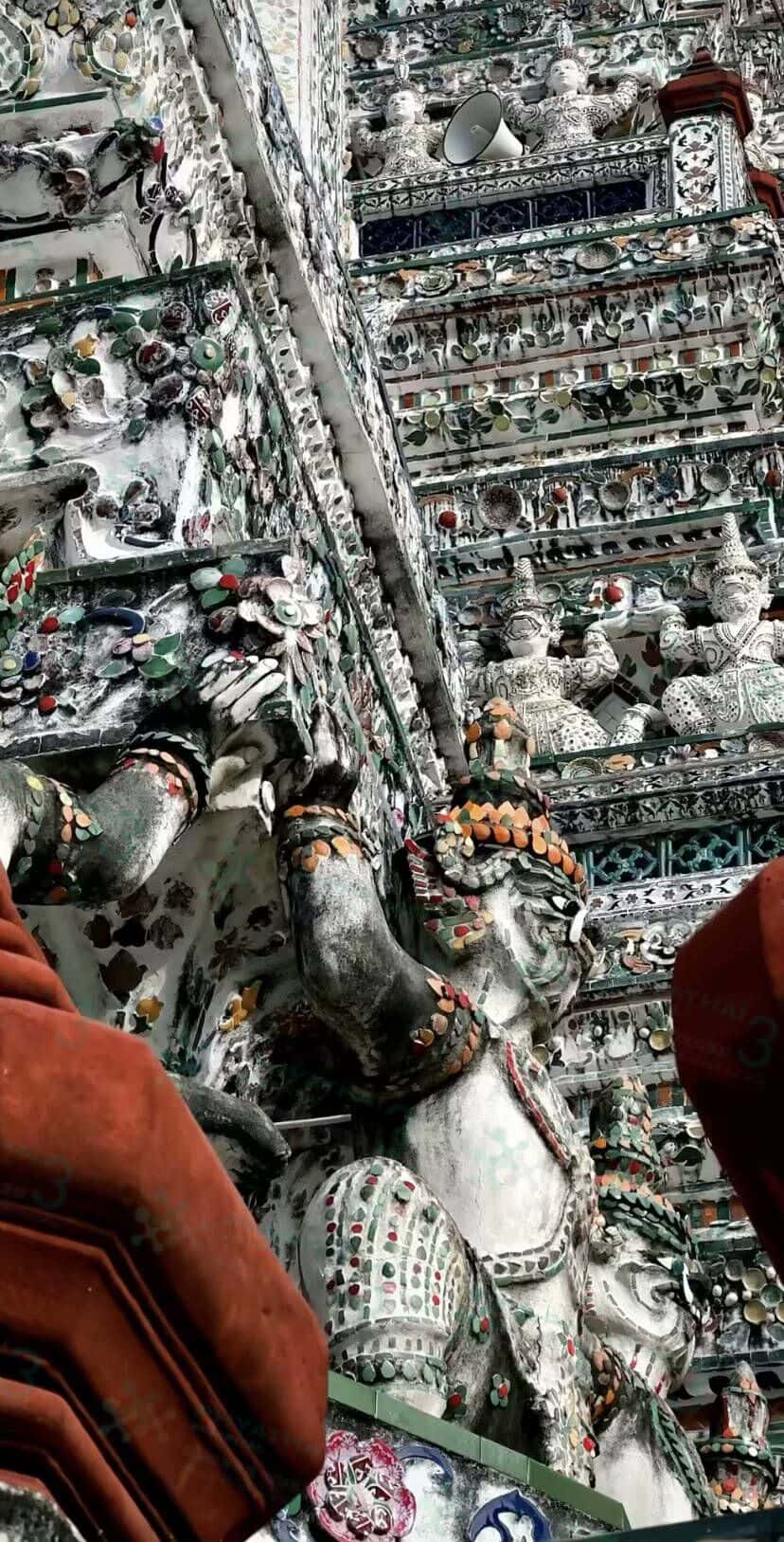 一到郑王庙就会看到4 座陪塔围绕着1座大陪塔,据说拉玛二世的遗体安放在塔的底部 每座都有一尊雕刻的菩萨像和佛陀本生故事的描绘画。塔用砖块垒砌而成,外面涂着一层灰泥,灰泥表面也贴着从中国运去的彩色瓷片及玻璃碎片。寺内殿中间供奉着郑王塑像。在这边大卡好了 也顺便到曼谷吞武里府的郑信路上,矗立着一座威武的塑像 郑昭骑着战马,手挥战刀,英姿勃勃。泰国人民和许多华侨常到此瞻仰献花,信仰人民都会祝自己跟郑王一样 事事顺利、百战百胜。