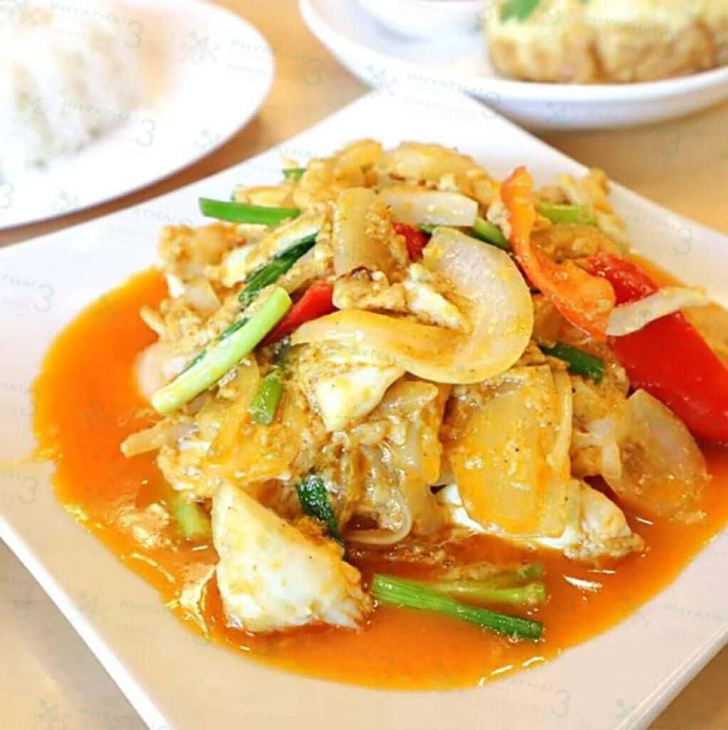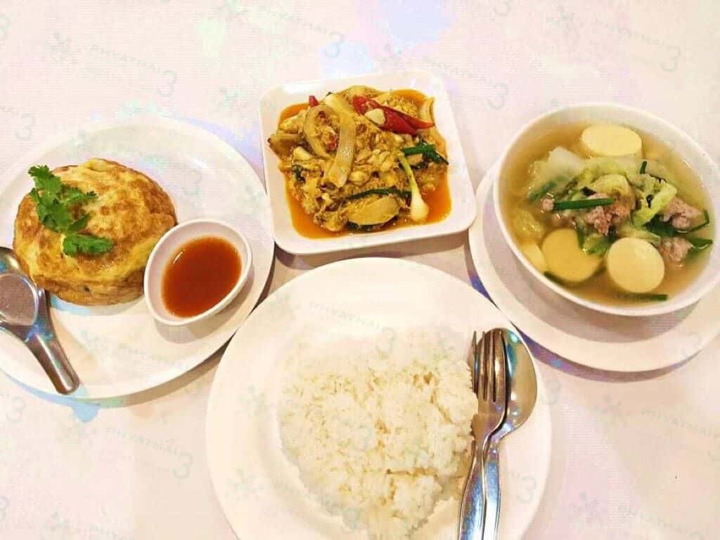 Krua Apsorn有份量充足的单人套餐,1饭2菜有虾又有蟹的组合只要100多泰铢左右(不超过200泰铢);这里的咖哩螃蟹可吃到厚实的蟹肉,和青葱、洋葱、辣椒拌炒的咖哩汤汁非常的下饭,搭配的猪肉末豆腐汤香甜可口,汤里洒的胡椒粉带点微微刺激感,最后再加点一份招牌蟹肉欧姆蛋也只要120泰铢,这种贴心小店怎能叫人不爱呢!