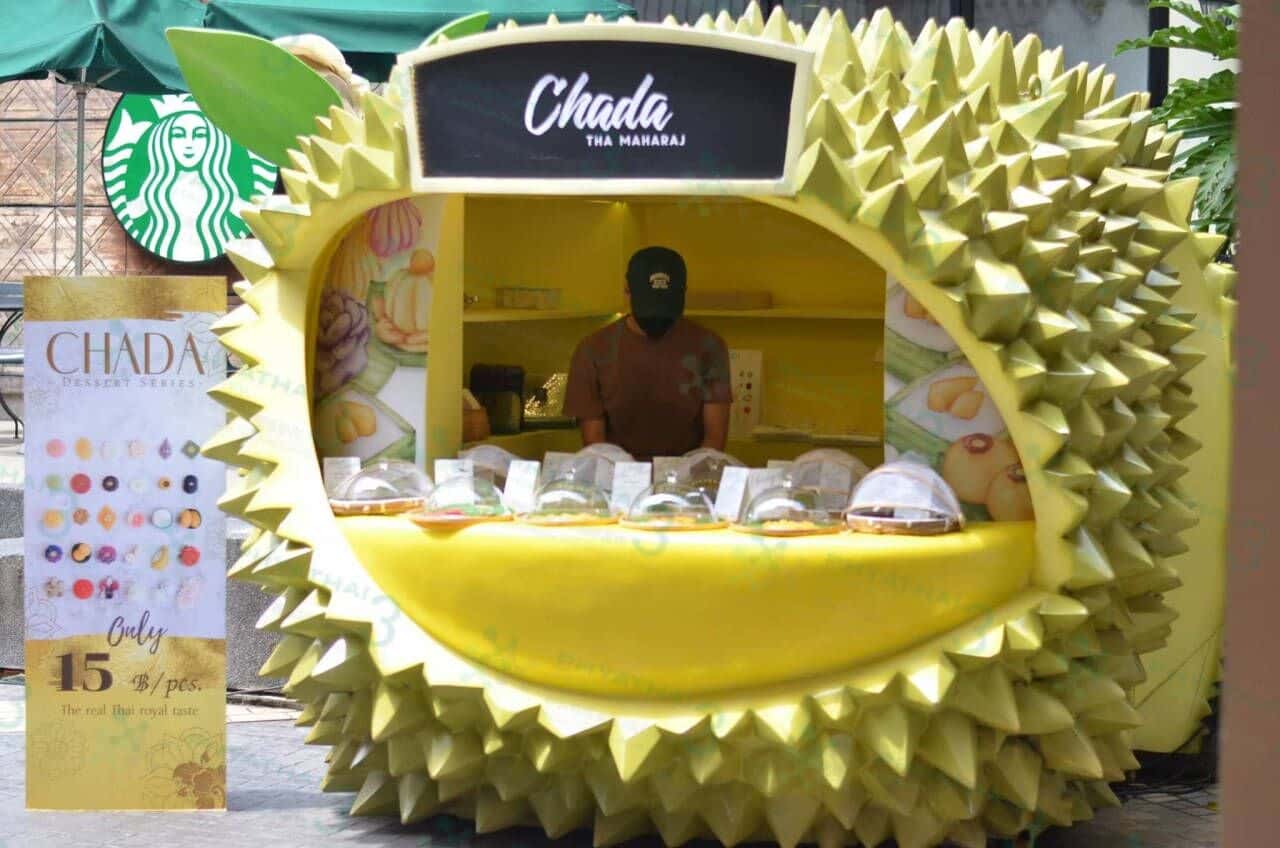 精致小巧玲珑泰式糕点CHADA-taste of thai 这吸引眼球的榴莲店面,里面有着手工非常精致的小糕点,小小的一口一个,每个只要15株,可以自己的喜好来拼成礼盒。 还在烦恼手信买什么的姐妹们,可以到central world 和 iconsiam 买得到哦!