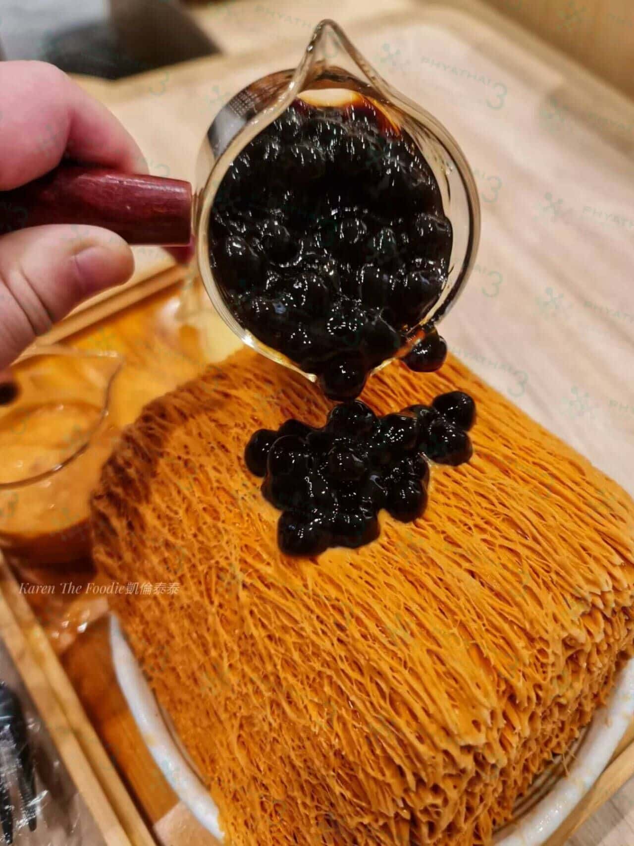 泰国最近火到爆“Mil Toast House “ 这个店里最出名的是他们的蒸面包,还有舒芙蕾法式吐司,还有最火爆的泰奶刨冰bingsu! 它们家的甜度,是我觉得吃过那么多间泰奶冰里面最不甜,但又超浓郁的,尾韵还留着那微苦的泰奶香气,冰本身超级绵密,而且份量十足,冰里面还藏着吐司!加上黑糖珍珠口味不错,很Q弹!