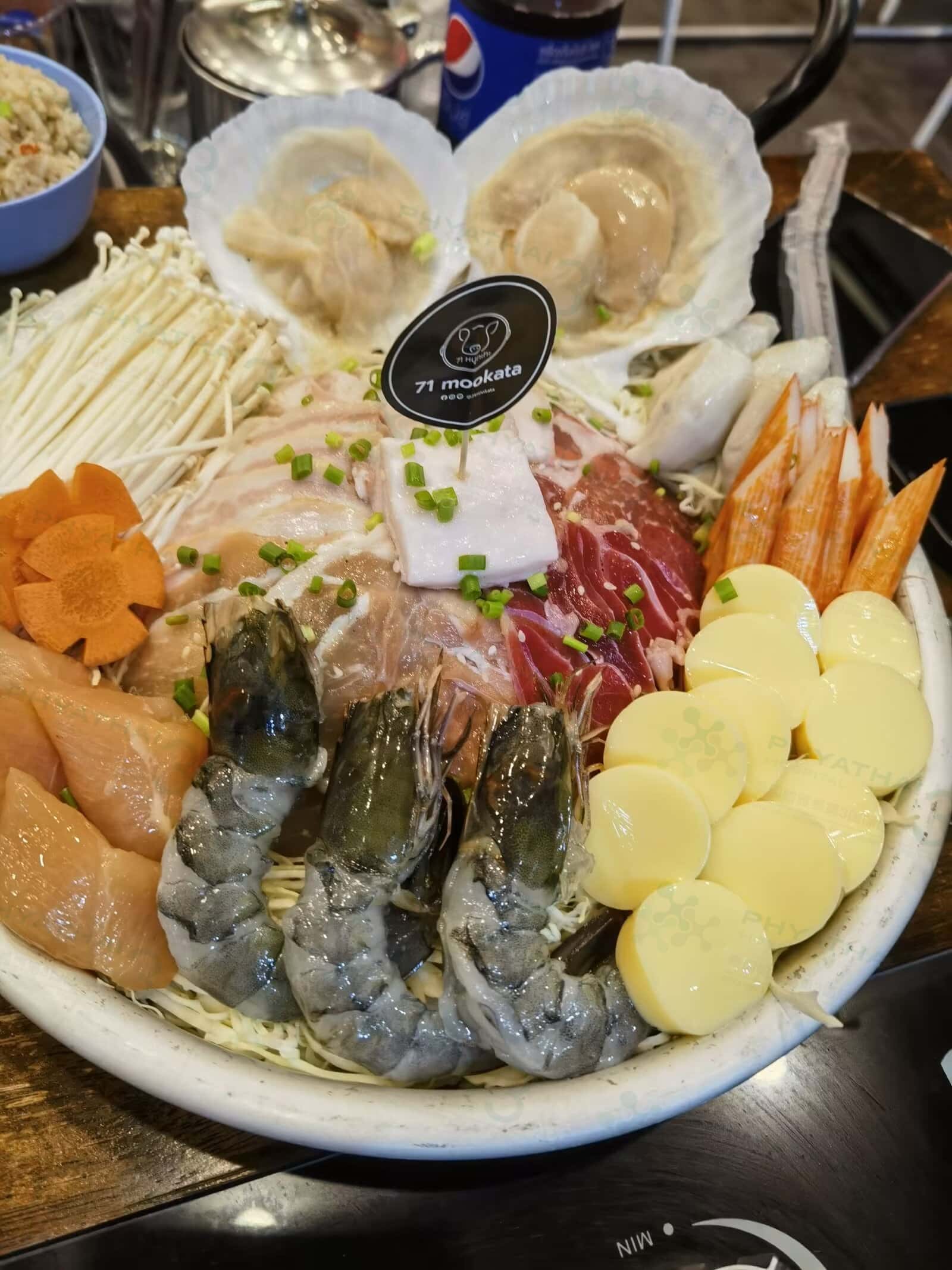 71 mookata这家店绝对值得来!来泰国姐妹门一定要吃一次(木噶他)这是当地人最喜爱的美食之一,中间是烧烤的部分周边一圈是煮汤的部分,烤肉的油顺着流到了汤里,煮出来的蔬菜也格外的香甜,这样的吃法真的很过瘾,这家店有室内和室外可以选择,姐妹们可以随意来,他们家招牌猪颈肉和阿根廷牛舌非常好吃哟,姐妹们只管放心冲~
