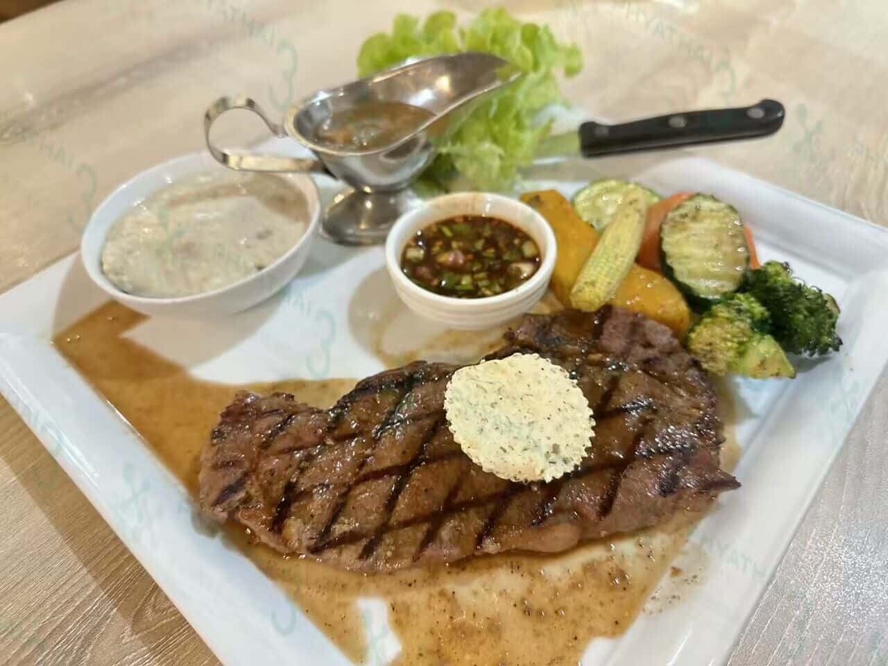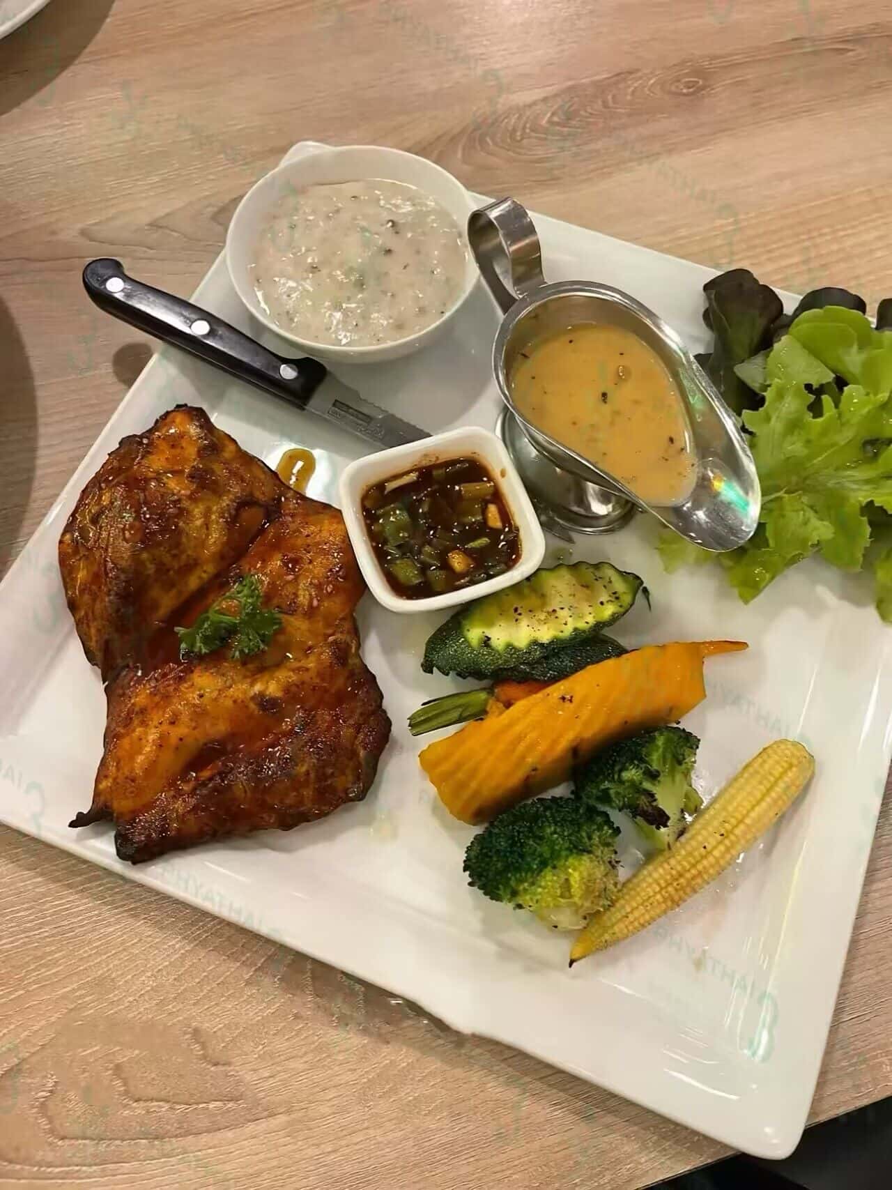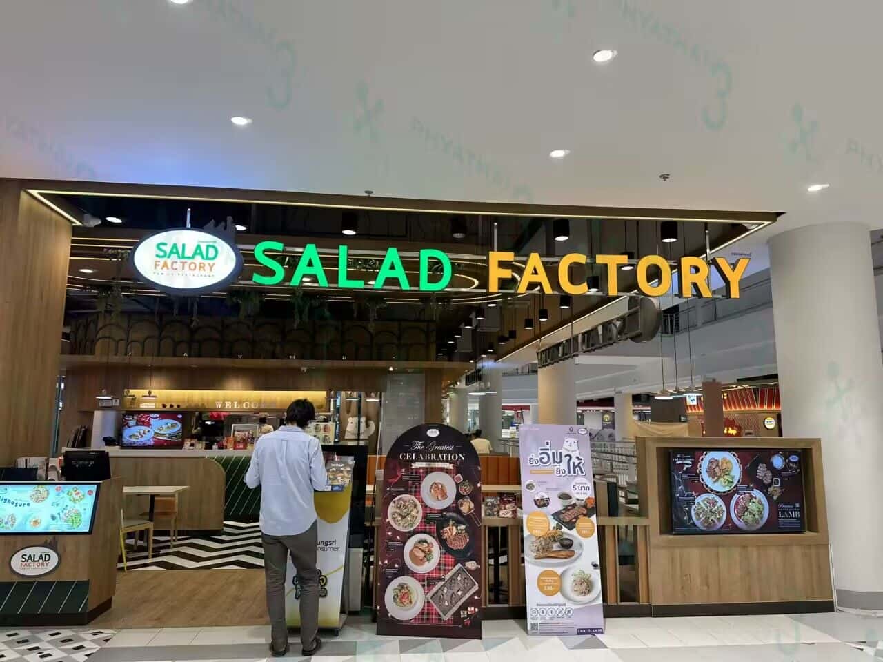 Salad Factory 主打健康、实惠的餐厅。 今天给大家推荐一家健康餐厅,店里装修舒适,味道鲜美、干净,价格又实惠,分量很大,有多种健康菜单可供选择,有牛排、各种肉类、沙拉、意大利面、汤、冰沙等很多菜单。这家店有有很多分店,可以搜索一下你家附近的分店。 推荐你不要错过的菜单是辣鸡排,一大盘,酱汁很美味,还有一个配菜是蒸蔬菜,非常美味。价格从 101-250 泰铢/盘起。