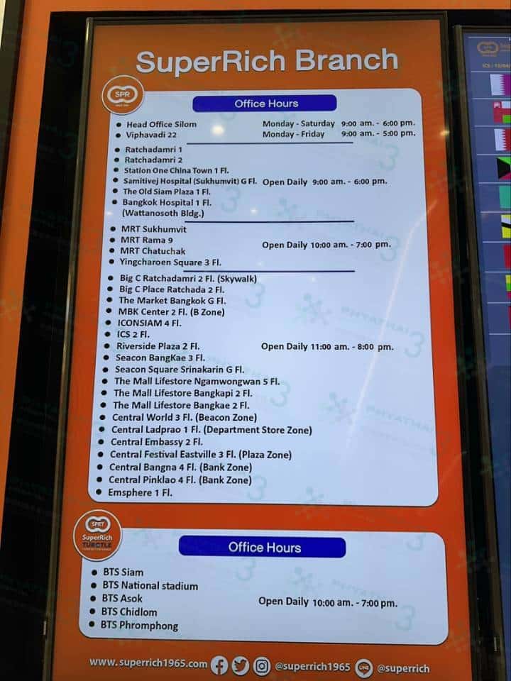今天给大家推荐一下泰国换钱汇率最佳的换钱店 Super Rich 而且他们家有很多分店地铁站、商场几乎都齐全的一家连锁换汇店、就算是节假日商场里面的店也是一样的开、图 4 有分店明细大家可以保存一下哈~离酒店最近的分店就是暹罗天地 Icon Siam 4 楼了哈~
