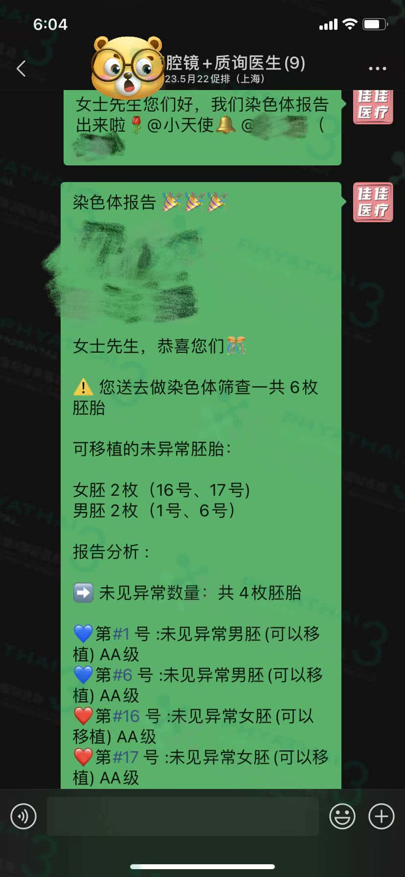 先生精子质量偏下,活力不好 达不到参考值,小姐姐跟先生一直在担心养囊后送筛检查结果不理想 染色体报告出来后心总算能放得下来,染色体报告儿女双全,2男2女,不仅是胚胎性别很理想 4个正常胚胎还都是AA级别,确实是一个谁看到谁羡慕的结果呀