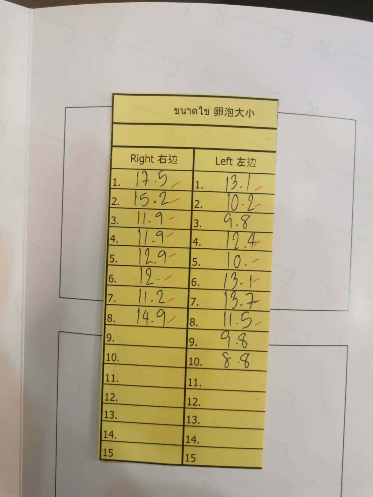 第3次见诊,取卵前最后一次见医生。 姐姐通过了8天打的促排针。从开始也有口服吃的促排药。目前看到的卵泡一共 18枚。她卵泡数量比较多,所以长得慢一点,虽然今天第3次见诊了,但是卵泡还不够大,医生给女士继续打最后一天针。明天才打夜针。大后天就取卵。