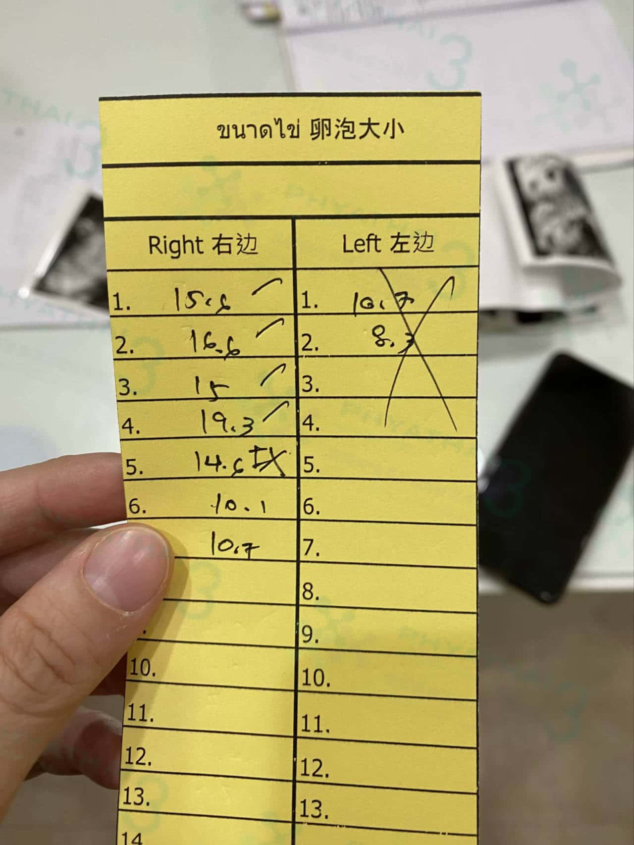 今天医生决定取卵时间啦, 今天最后一天打促排,明天晚上21:00 过来打夜针,后天取卵。 今天卵泡发育比上一次好。11 天过得很快~见诊时女士说快到取卵就有一点紧张,睡不太好。 医生说可以担心,但不要担心太多不然对卵泡的发育有影响。现在还没有取卵最好保持心态。今天医生有开安眠药给女士服用。 关于安眠药对促排没有影响,服用这种药物只有优点。因为它会让患者睡得很好。 安眠药的费用也很便宜1粒才15泰铢。 若哪位试管姐妹睡眠不好可以安心服用药。
