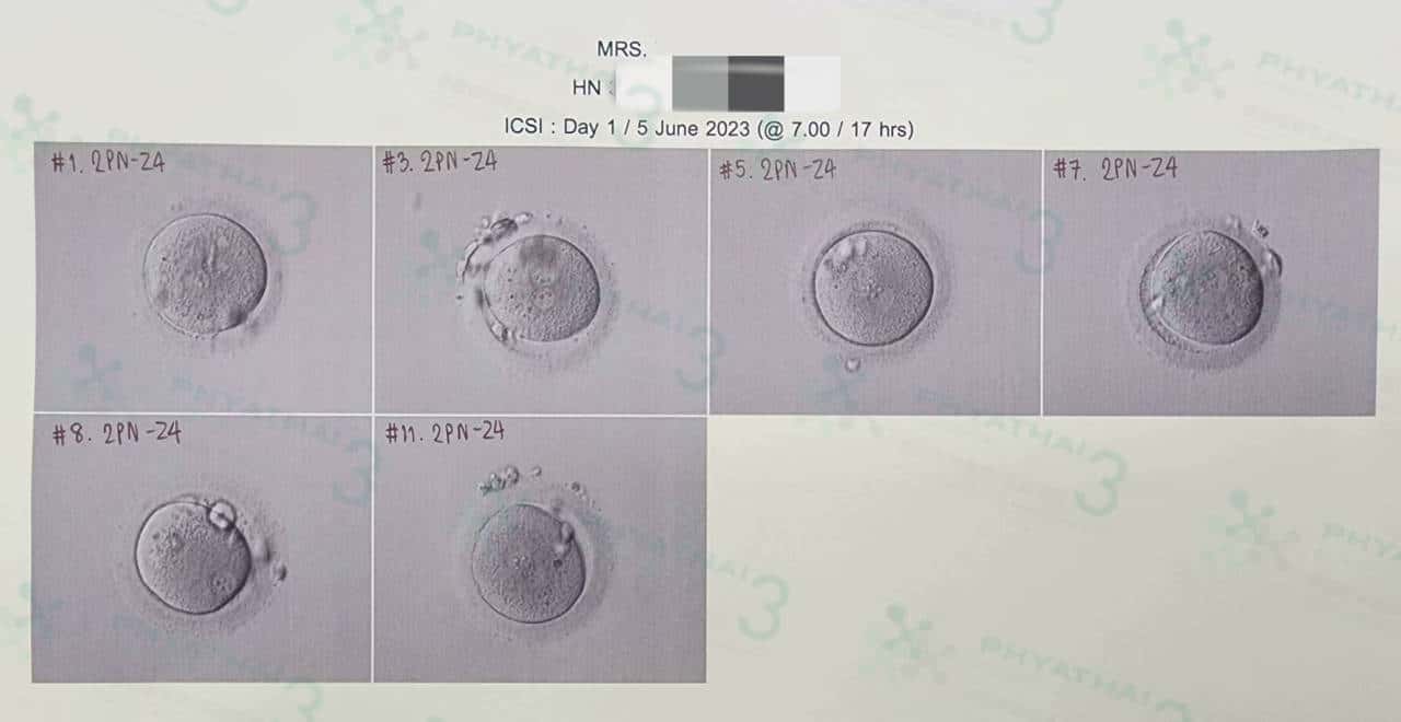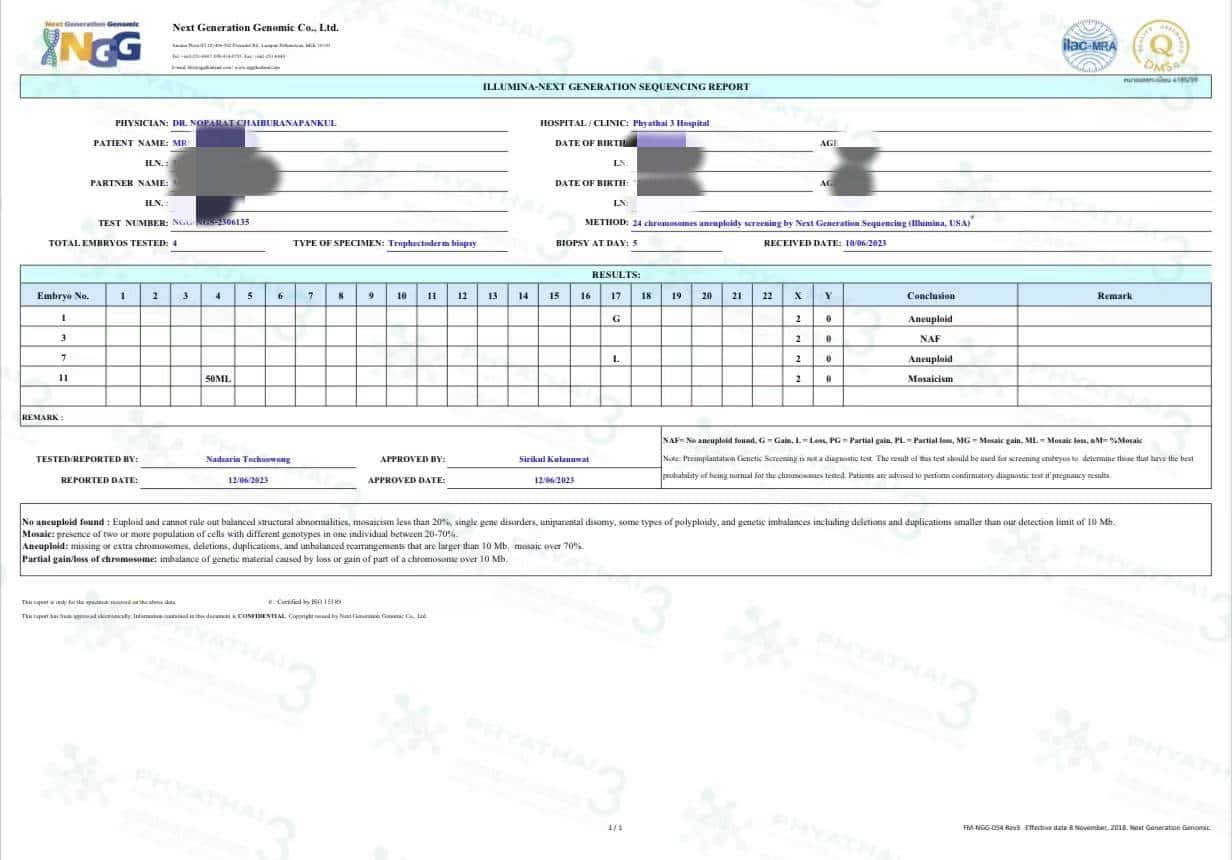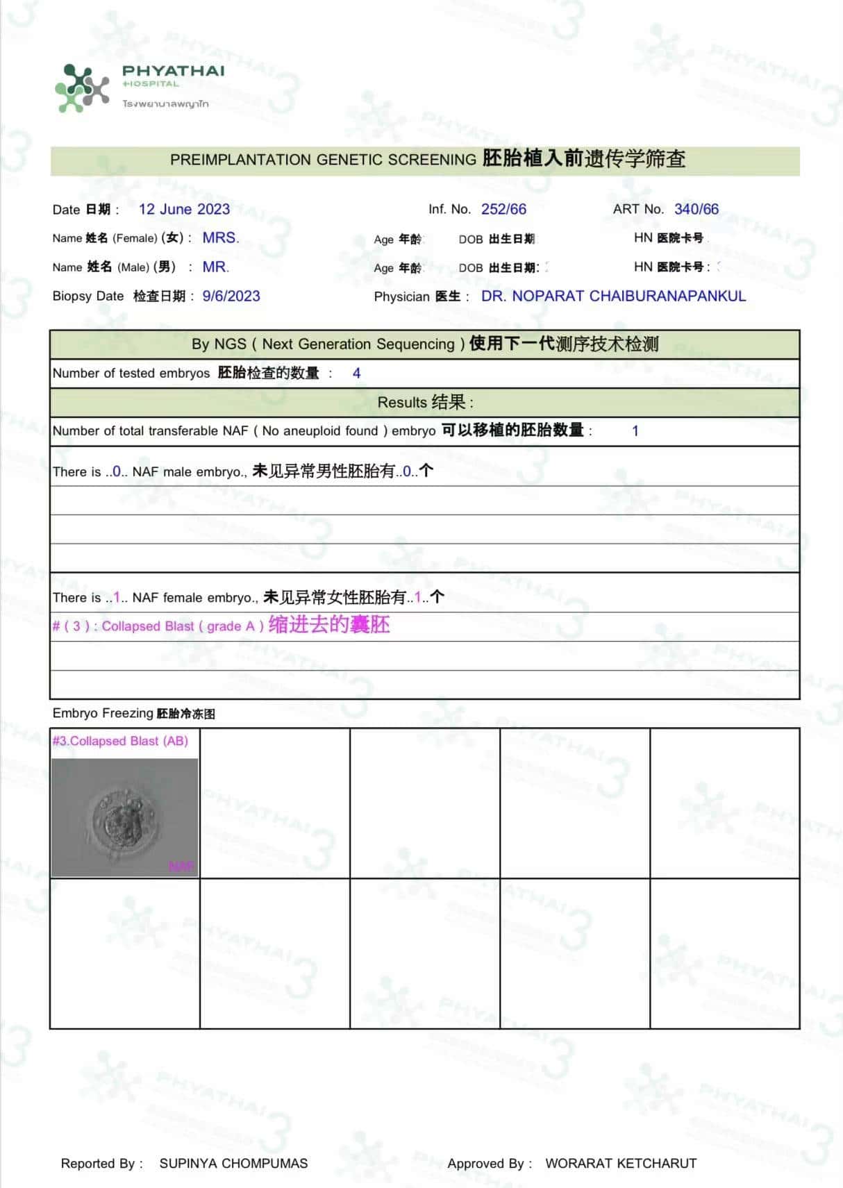 女士期待已久的小公主终于来了.卵子质量不好取卵21最终受精成功6枚,最终第五天能够有 4 枚囊胚可以送筛,简直是出乎意料,帕3实验室胚胎师太太太给力,等待了最煎熬最心惊胆战的五天后,送筛结果果然没有让人失望,送的 4 枚都是女宝,有一枚是健康可移植的,可把女士和先生高兴坏了,知道染色体结果后就立马着手准备调理好身体赴泰移植啦
