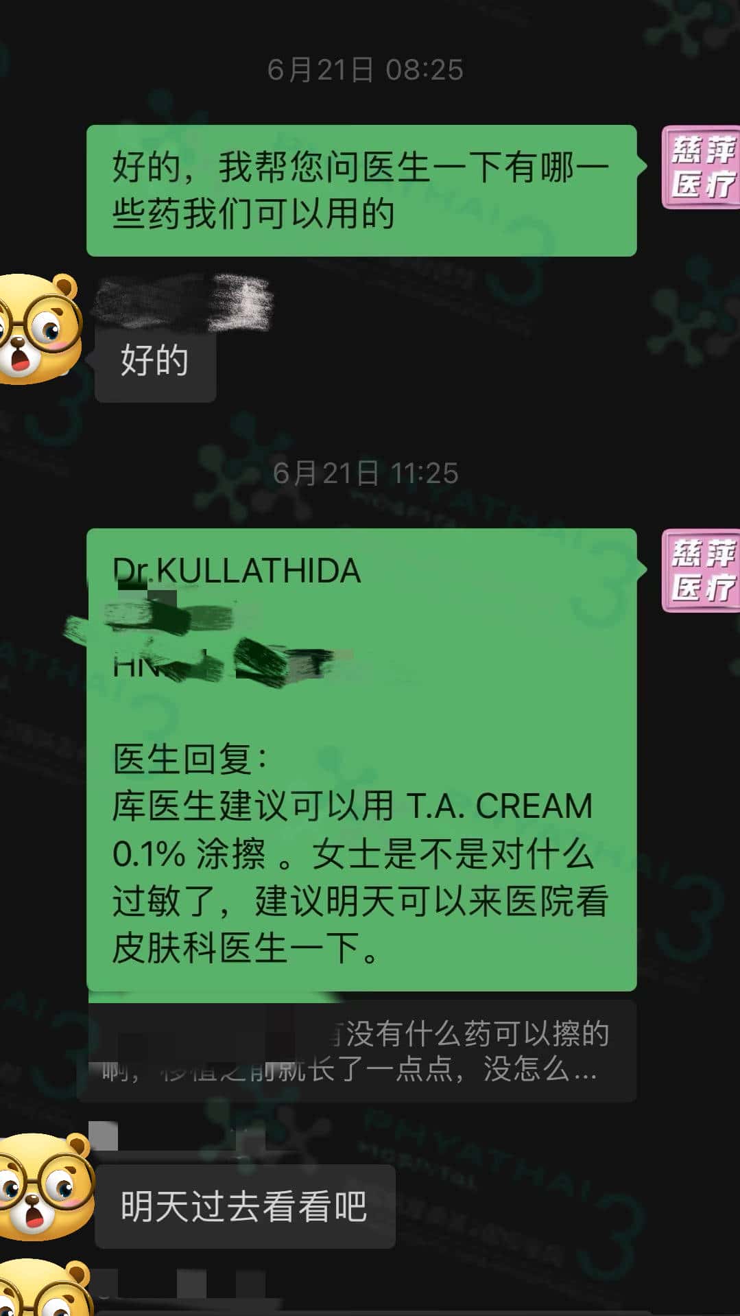 移植后每次用药的时候女士都是很注意,只用库医生的药,其它的药就尽量少因为怕会影响到胚胎,这次手上起水泡了,又不敢随便用药,库医生就建议先买涂擦药来先涂一下,还特意推荐专门的皮肤科医生给我们,当天去14楼就诊医生很温柔可爱并且特别细心,她知道女士刚移植也能体谅女士的心因为现在女士也不想吃药,所以医生给我们开的都是涂擦药,见诊完就有护士帮女士涂药大概20分钟就可以回去了,真棒哦,我们医院的服务真好