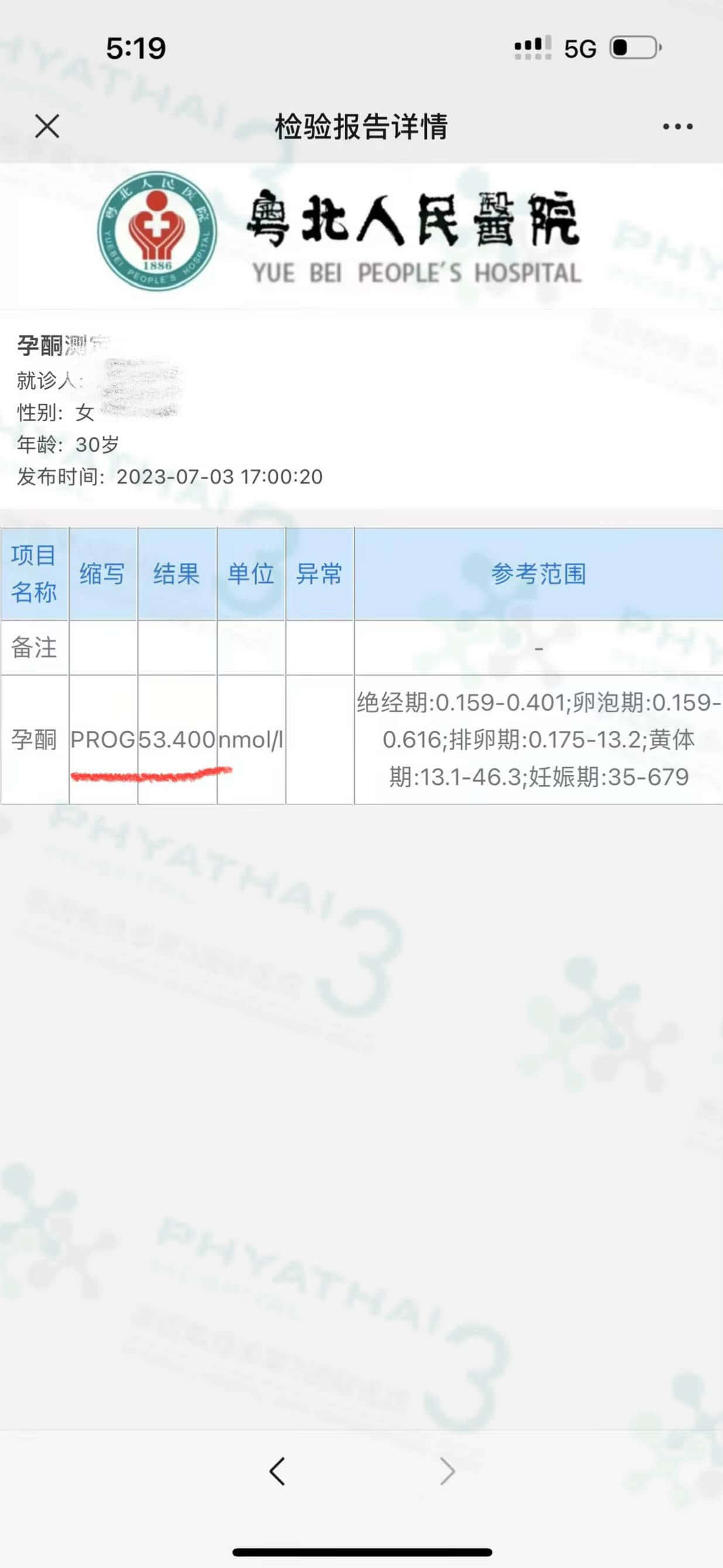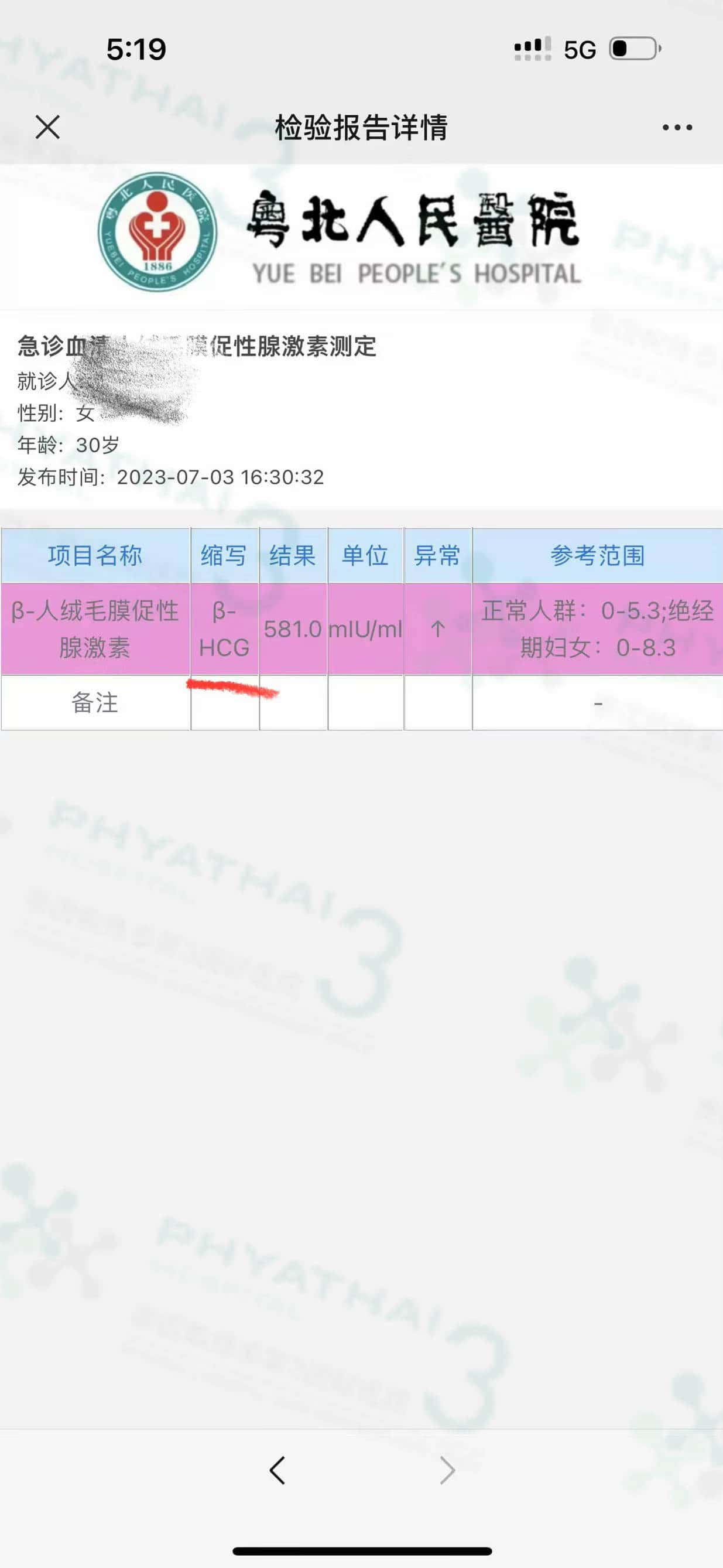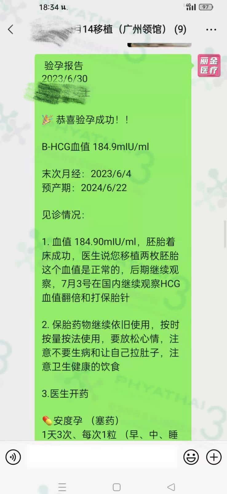 回国查翻倍的患者来报道, 龙宝发育挺不错,才隔了两天血值从180 今天已上升500 左右了。 患者经常问过移植需要在泰国呆几天才能回去。 一般验孕成功就可以马上回去。关于查翻倍或后期产检可以在国内做检查和保胎。 所有医生开的药不可减少或自己停止,但如果国内医生想增加药量是可以的。孕期是很长的路需要一步来观察,继续按时用药接下来等6周去阴超查孕囊。 我们希望一切顺顺利利,平安到生宝。
