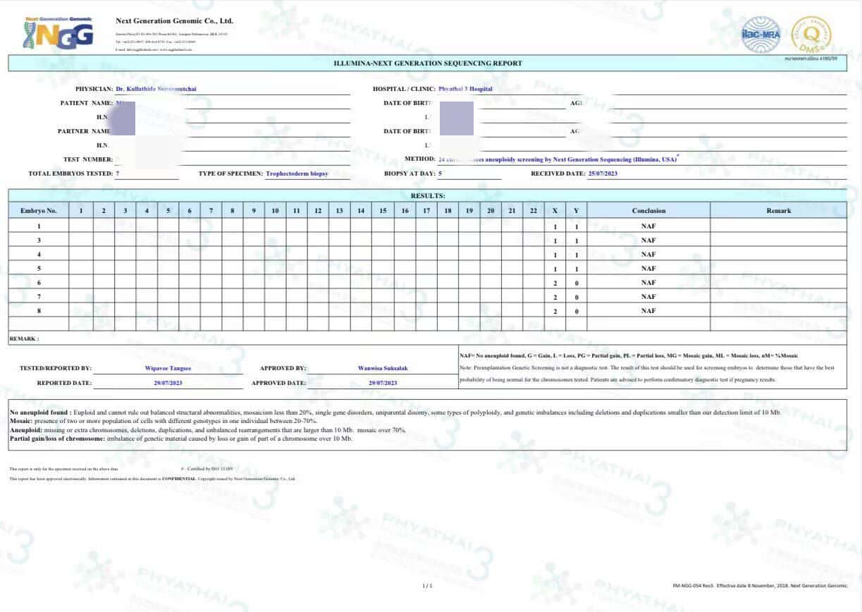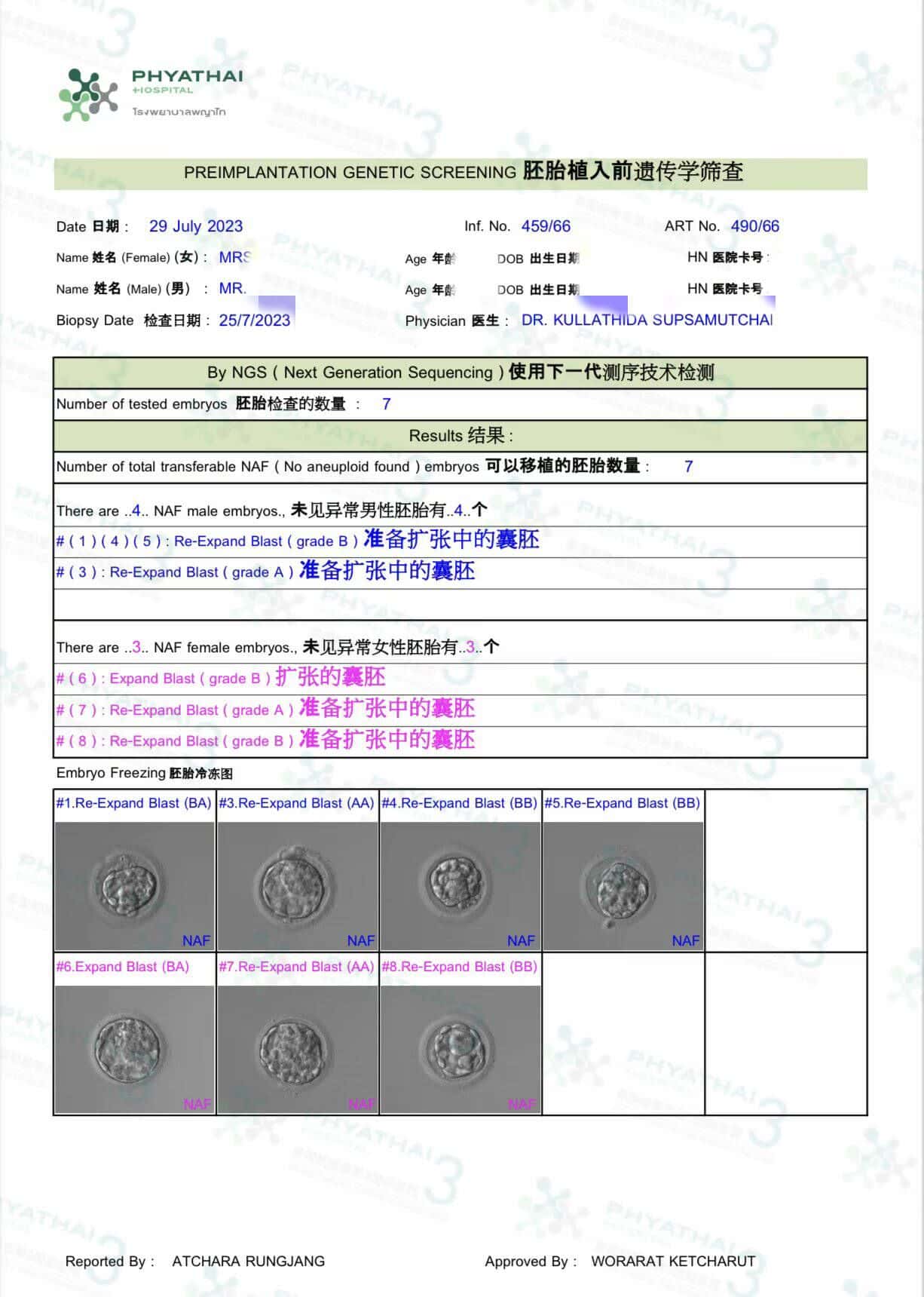 多么养眼的染色体报告,空空荡荡没有任何多余的字母,小姐姐取卵成功受精 7 枚,第五天成功养囊 7 枚,这养囊率 100%啊!而等待了将近一个星期的染色体报告也出来了,7 枚全部健康,有 4 男 3 女,小姐姐还有点不太相信,养囊 100% 没想到筛查也 100%!太棒了,时间很快,再给一个月小姐姐就可以来接宝回家啦