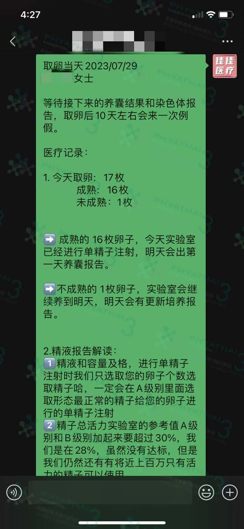 太牛啦!小姐姐第三次见诊时发育较好卵泡14枚,取卵当天通知取了17枚卵子 当天16枚就已经成熟了,小姐姐非常开心说终于能松的了一口气 她最近对卵子数量有些担心但下面还得看看卵子跟精子质量啦,先生弱精 但胚胎时筛选精子时 会选活率跟形态A级里面来受精的,希望多多健康囊胚 多多男宝哦