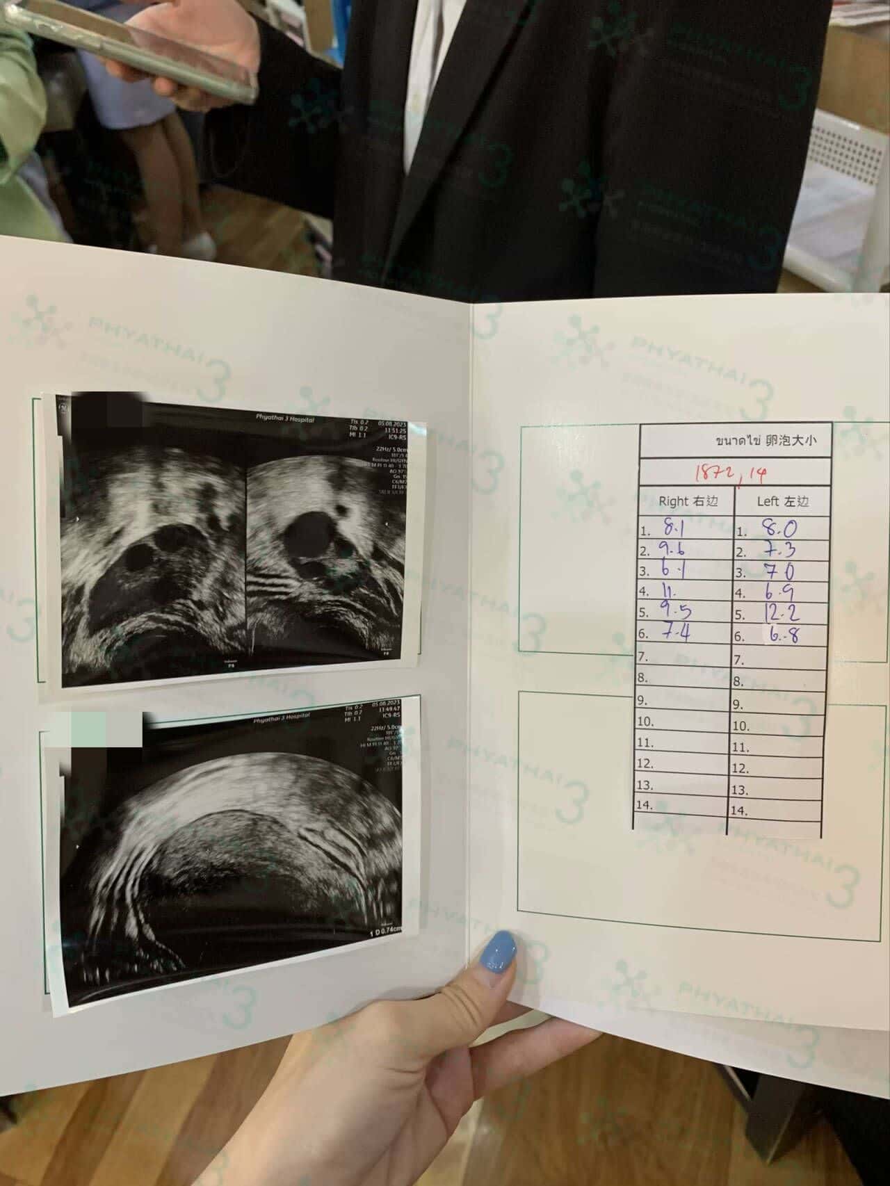 幽默的先生跟女士说恭喜你又增加了两枚,女士忍不住笑了出来哈哈。今天是女士促排五天后第二次见诊,卵泡尺寸都发育了不少,抽血检查的雌二醇激素也上升的不错,AMH值也出来了,有 3.64 噢,医生说可以开始打保卵针了,取卵时间也还是原来预估的时间,一切都在往好的方向发展