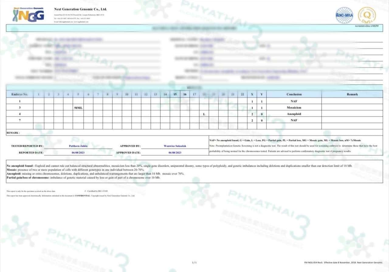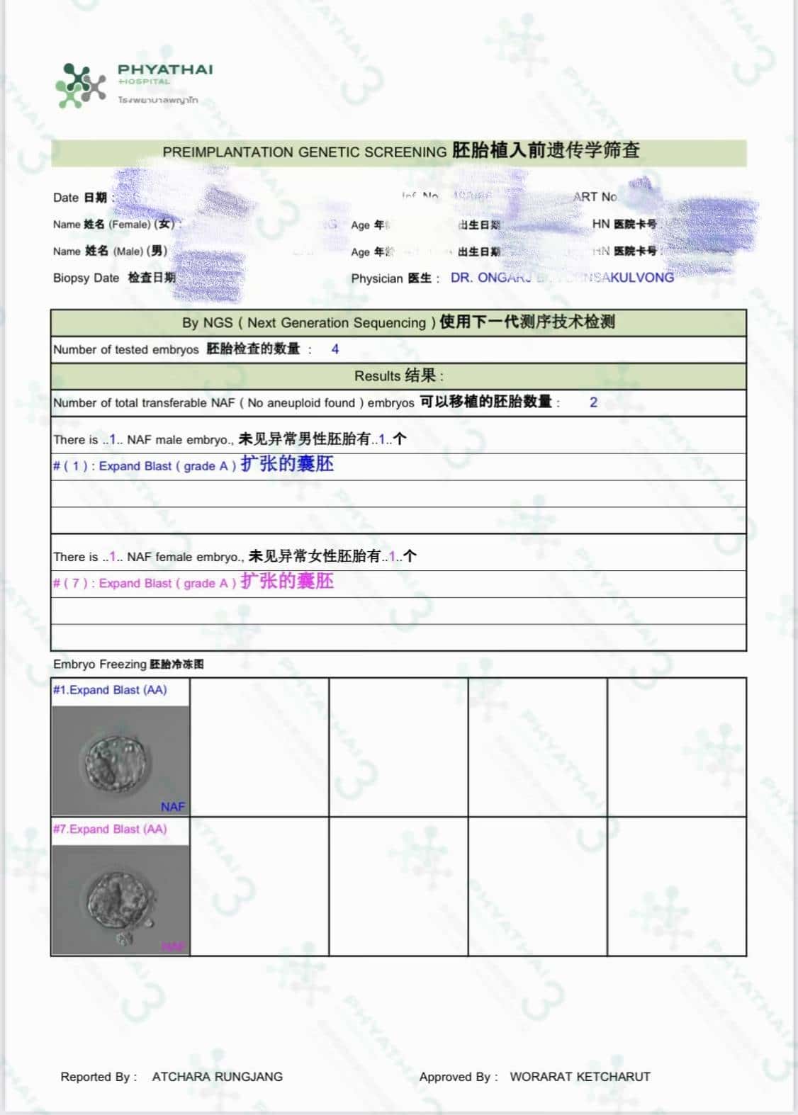 泰国本地早衰的患者, 第一天养囊受精6个, 送筛4个,起初女士认为不会有健康的胚胎。因为女士工作压力很大和经常熬夜。 女士已做好准备二促了但今天筛查结果出来有2个健康是一男一女。 取卵的时候医生仔细做检查有内膜粘连,移植前医生建议先做宫腔镜处理,为了增加成功率。 现在女士预约了国内医生做宫腔镜检查好了,接下来等身体恢复正常了再过来移植。