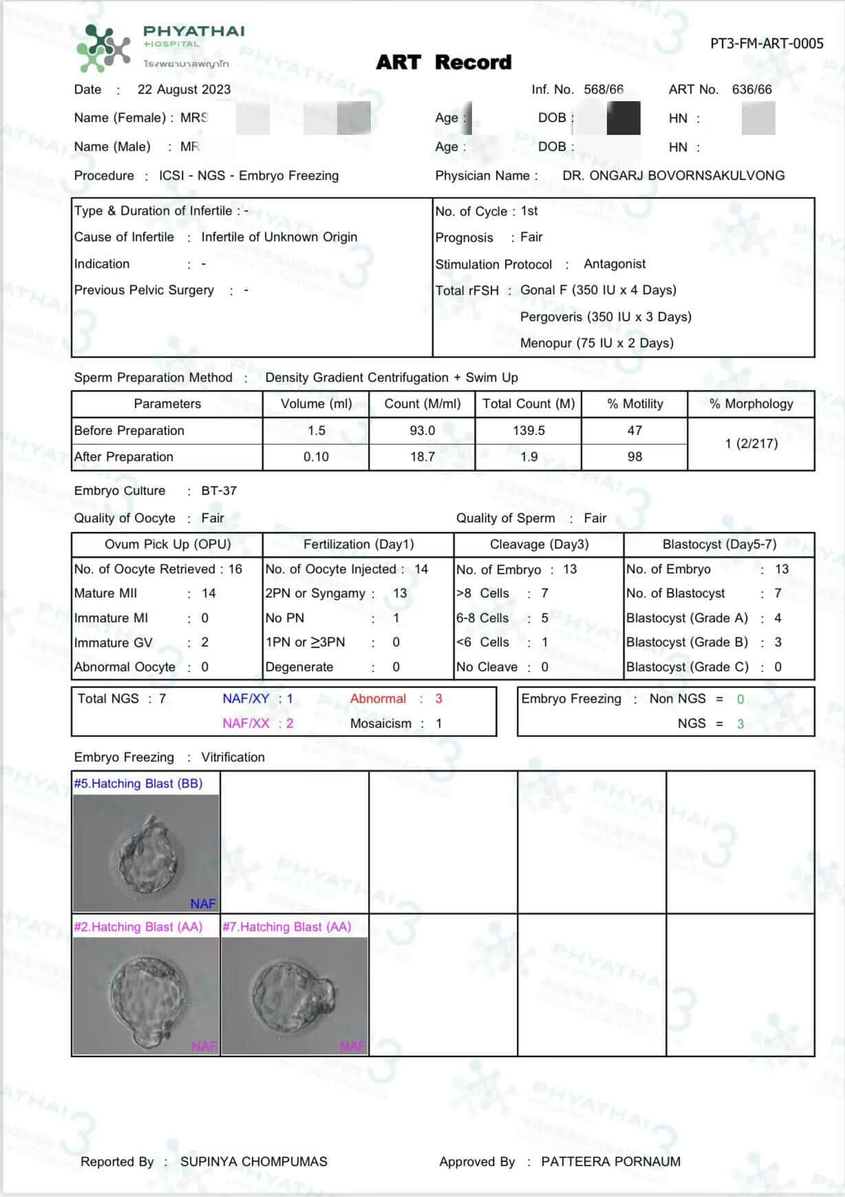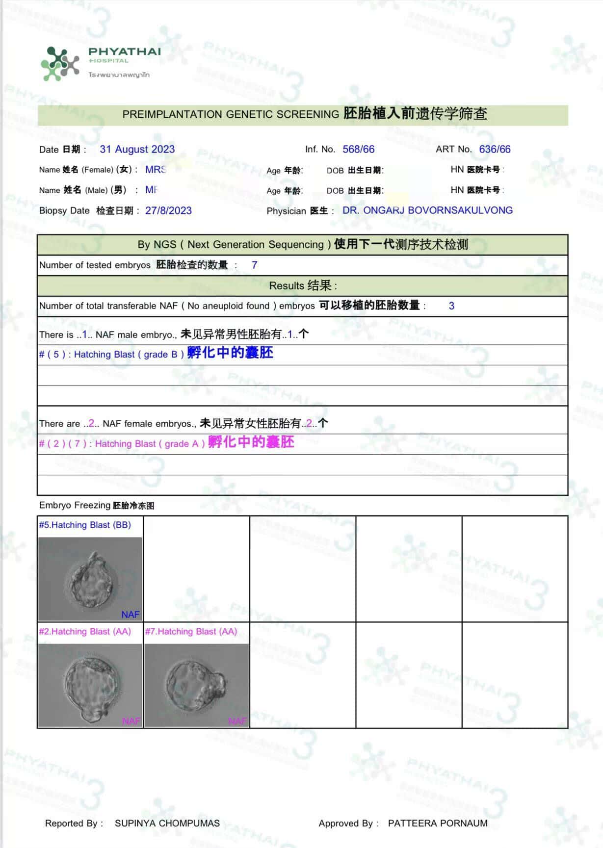 9 月首份新鲜出炉的染色体报告,促排期间的画面还历历在目,转眼间染色体报告已出结果,小姐姐如愿的得到健康的胚胎,对小姐姐的印象很深刻,因为每一次来见诊打针都是风风火火的,来时说一句 “嘉琪,我来了”走时一句“嘉琪,我走了”,然后小姐姐和先生就到处吃喝玩乐去了。得知有健康胚胎,小姐姐和先生很是开心,而作为医疗翻译的我也是真心替他们感到高兴,期待下一次见面一切顺顺利利