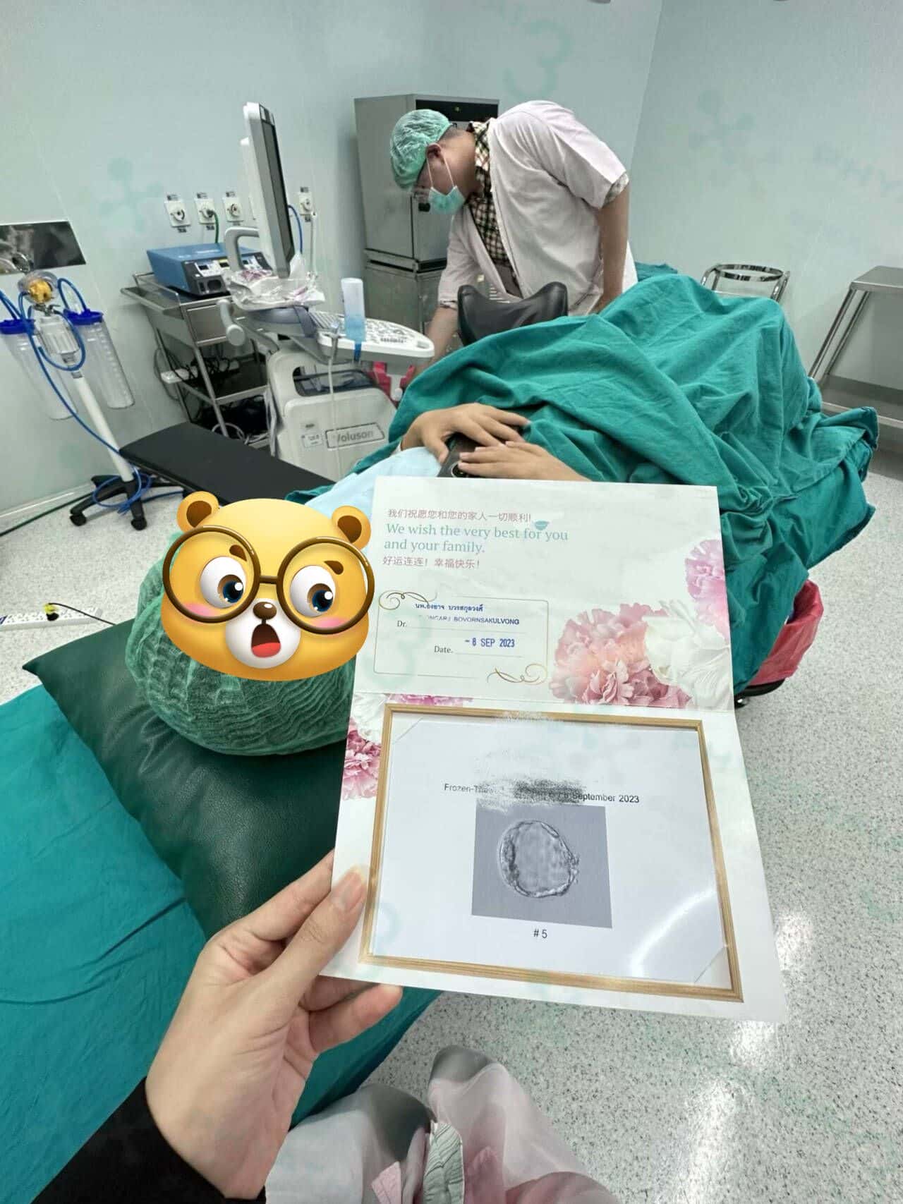 今天我们移植,但是进行手术中,女士一动我就悄悄地听到一个小小的声音,但是看到妈咪移植的时候一直抱着小胚胎的图片,出来休息准备打保胎针的时候才发现在上衣口袋中有一个东西,果然我听见的就是零食包装袋触发音,女士跟我说这是昨天过来验孕的姐妹给她的,让她们接好“孕”,还给她分享满满的正能量,所以今天他们夫妻也准备很好的心情过来接好孕啦。很暖心的,每一次女士都拍照记录一下,也祝福他们一次成功,好运降临送您一个礼物的噢
