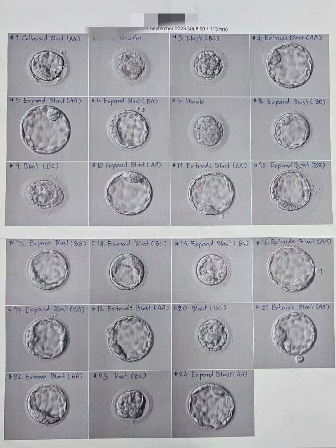 受精成功23养成囊21! 超牛!取卵当天医生取卵子出来24枚,当天全24枚都成熟。第一天养囊23枚顺利受精成功,最后第五天养囊21枚都发育成囊可以送筛了。所有成囊胚胎等级非常不错都是A和B级别,这个结果也太好 已超出我们的预计啦。不得不说我们实验室很厉害!后续我们一起来等染色体报告,希望我们有多多健康胚胎可以移植哦