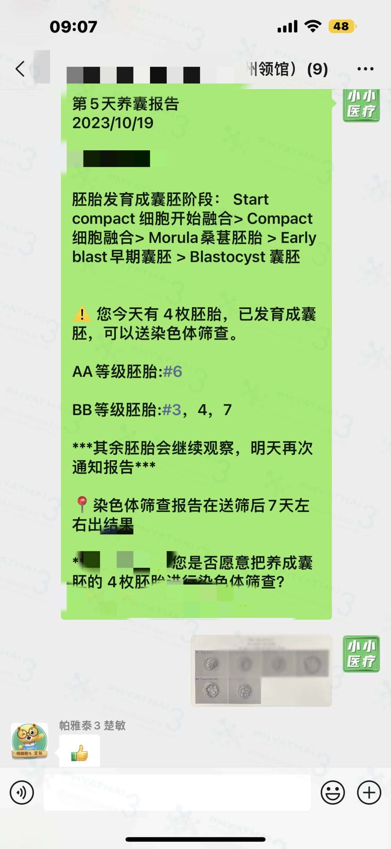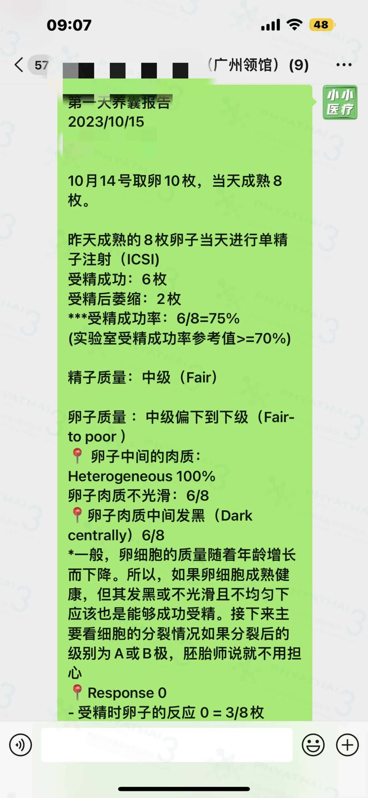 33岁早衰小姐姐 卵子质量中级偏下到下级,取卵之后实验室把卵子进新单精子注射。第一天养囊受精成功6枚,养到最终有5枚胚胎能够成囊胚呢。不得不说我们帕3实验室的养囊技术太厉害 非常值得夸奖,接下来实验室会取出外围细胞去送筛。好期待染色体报告呢,希望我们有多多健康胚胎可以移植啦