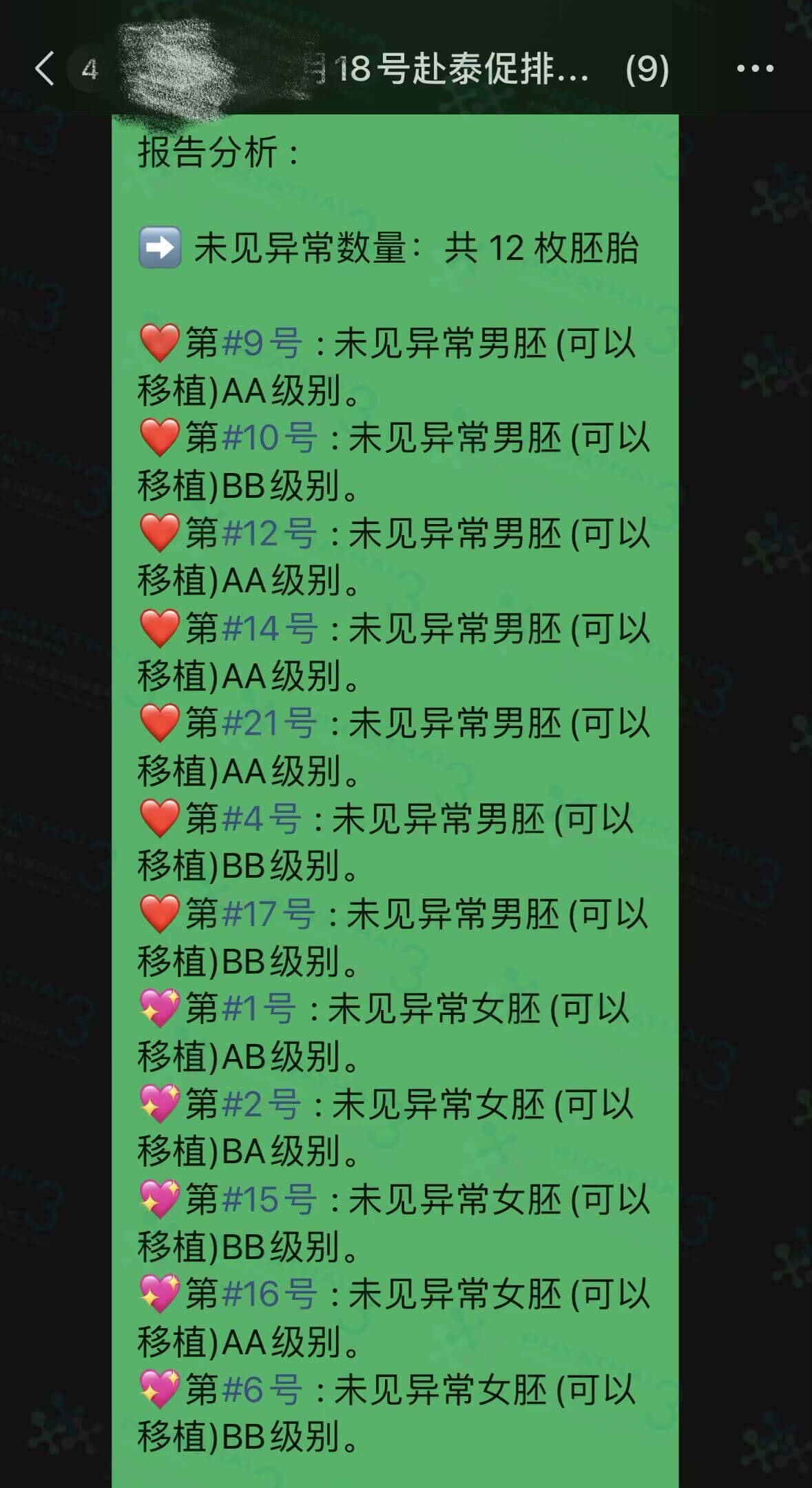 哇哇哇~染色体结果出来啦 今天我们小姐姐的染色体报告出结果了,第三代每个人都会送筛检查染色体,以筛查胚胎是否存在染色体异常。提高受孕成功率 当我拿到PGT-A有过关的胚胎就特别惊喜,因为 送了13枚 健康12 枚(7个小蓝5个小粉),当他们的孩子一定会非常快乐幸福,最重要的是,在这促排的这几个月,小姐姐总是非常准时报到而遵守医嘱,我想最后养出了好卵好胚胎是她最好的回馈了,继续加油哦 好开心
