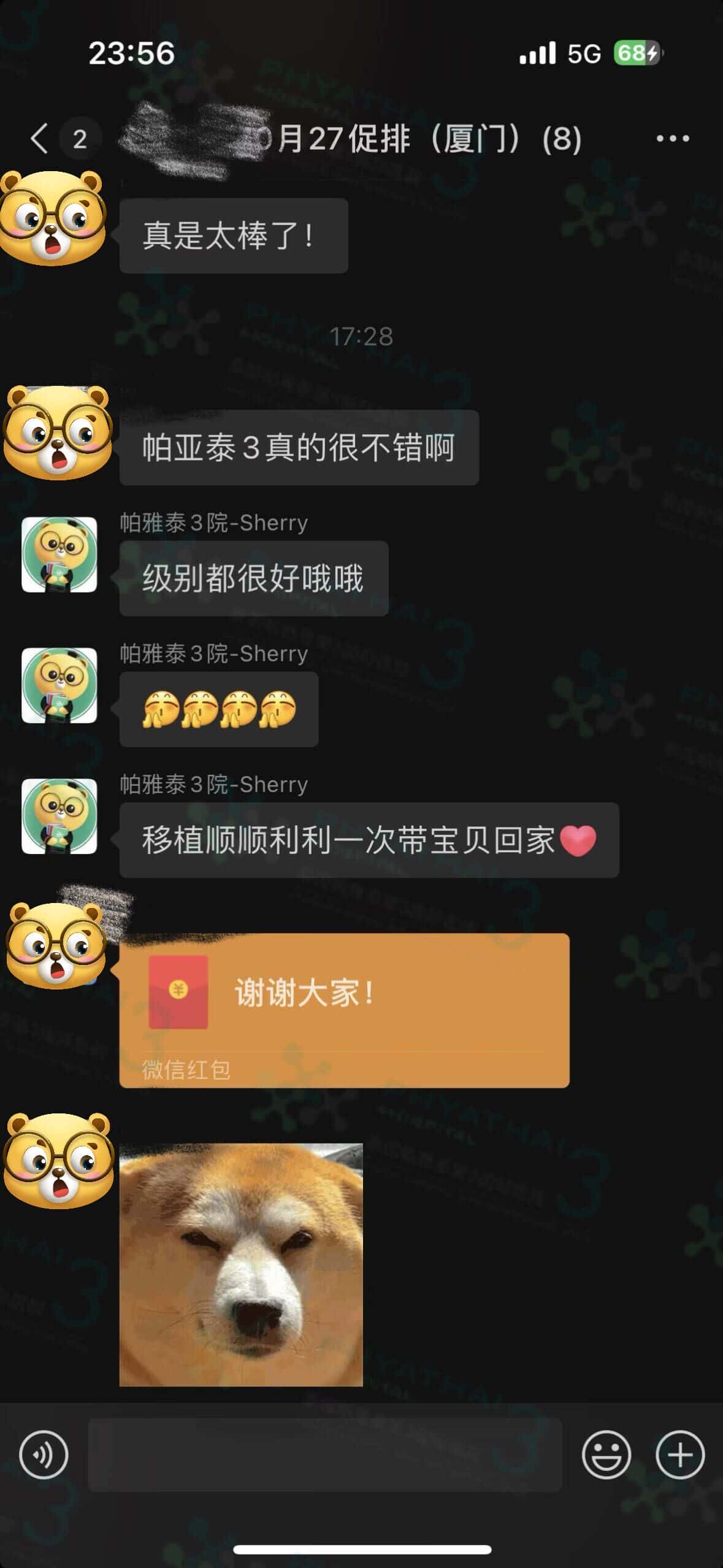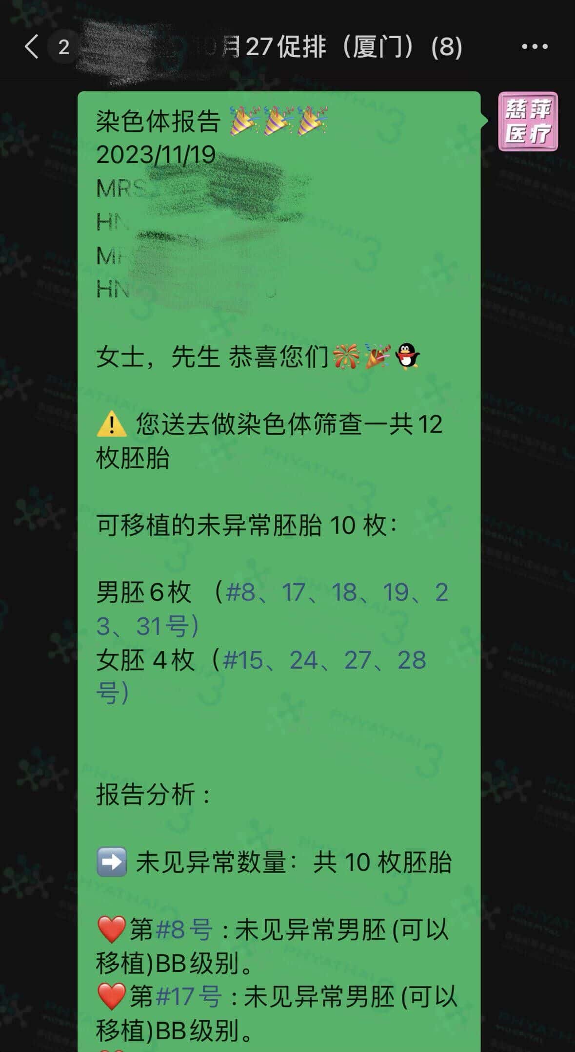 不要放弃 您们说过的想要 试管过程当中没有那么容易,但也没有那么困难,只要您知道最想要的是什么,坚持了就会有很好的回报,嘻嘻 今天我们的染色体报告结果也已经出来了,通过女士和先生的努力我们送筛了12枚就有10枚健康可以移植呐,一通知他们的好消息,幸福爆棚快乐满分,我们一起继续前行继续努力,下次就可以来带宝宝回家啦