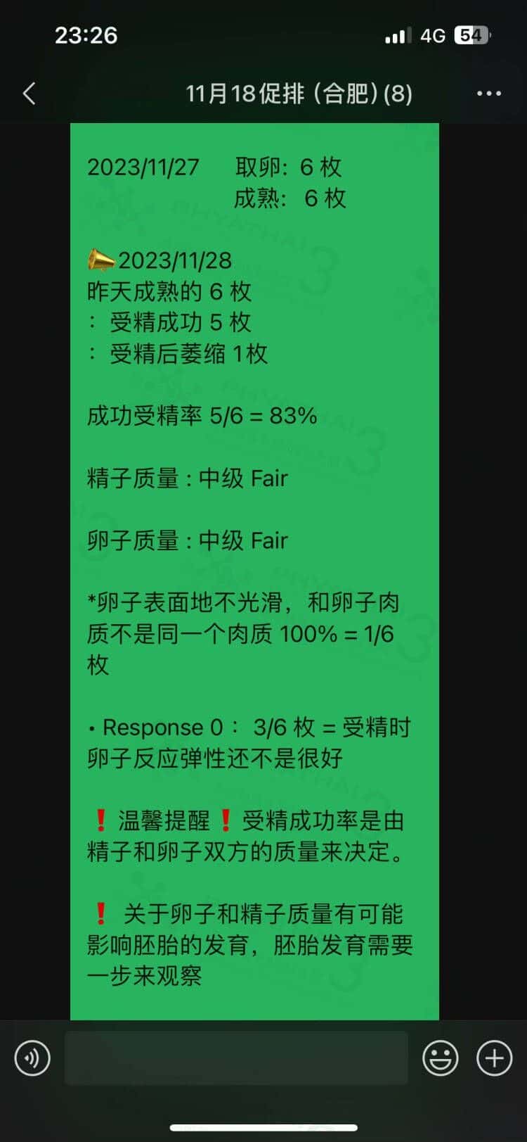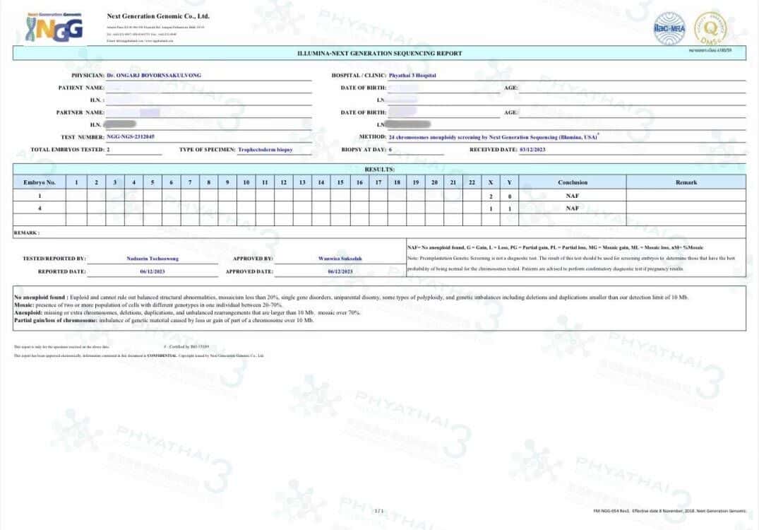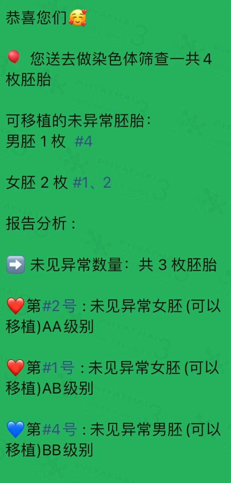 哇,医生的治疗方案真是无与伦比的呀。女士和先生的卵子和精子也了不起,姐妹的基础卵泡从第一天就是6枚 取出来呢一个也没缺,受精成功5枚 送筛成功就是达到4枚了,虽然一个是嵌合体但他未来也还能用的哈,最重要的是这位女士想有小公主 最终就有了2个AA级的啦。我们现在会替女士照顾胚胎哈等几个月调理内膜和恢复好身体就可以来接宝宝了。