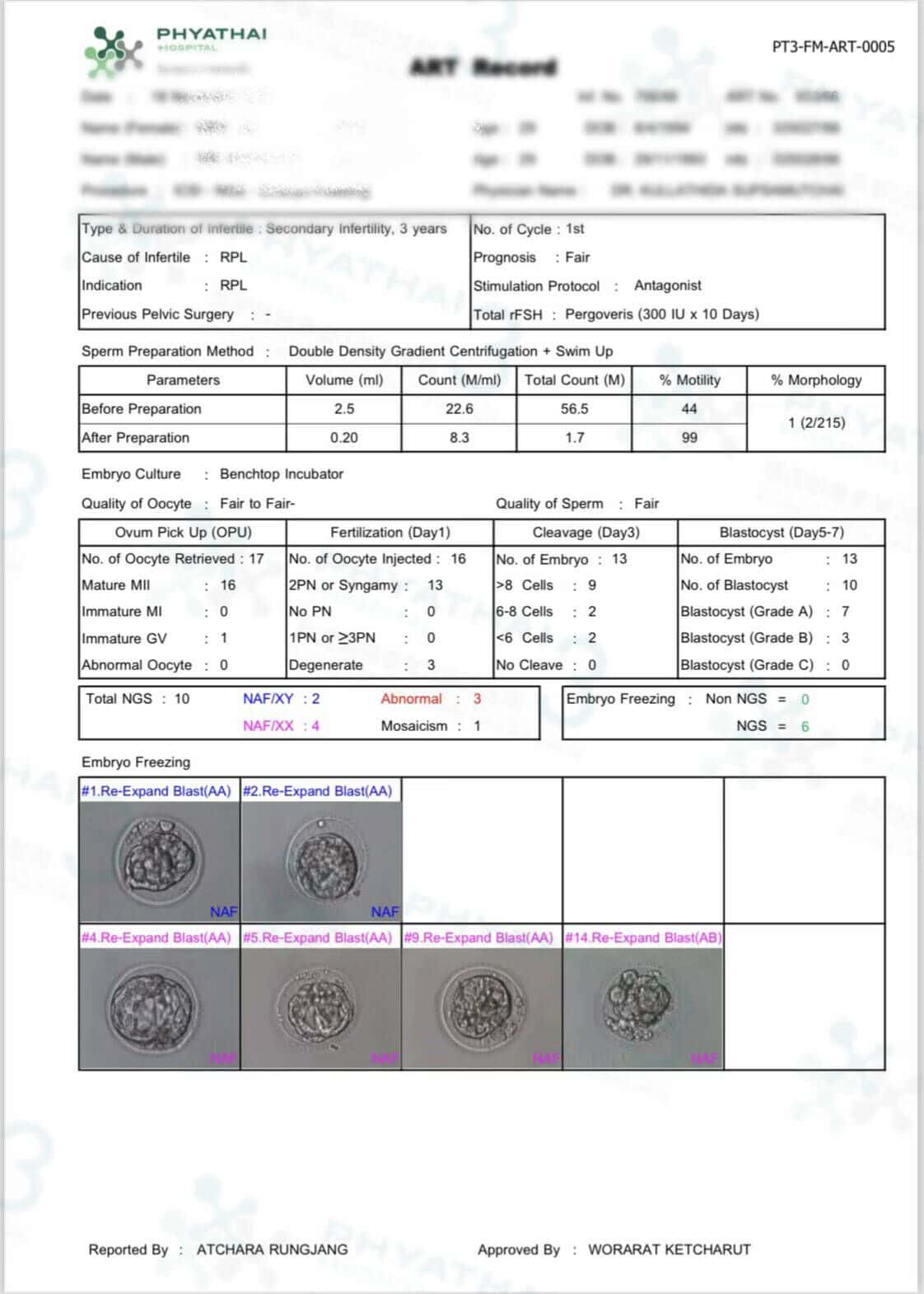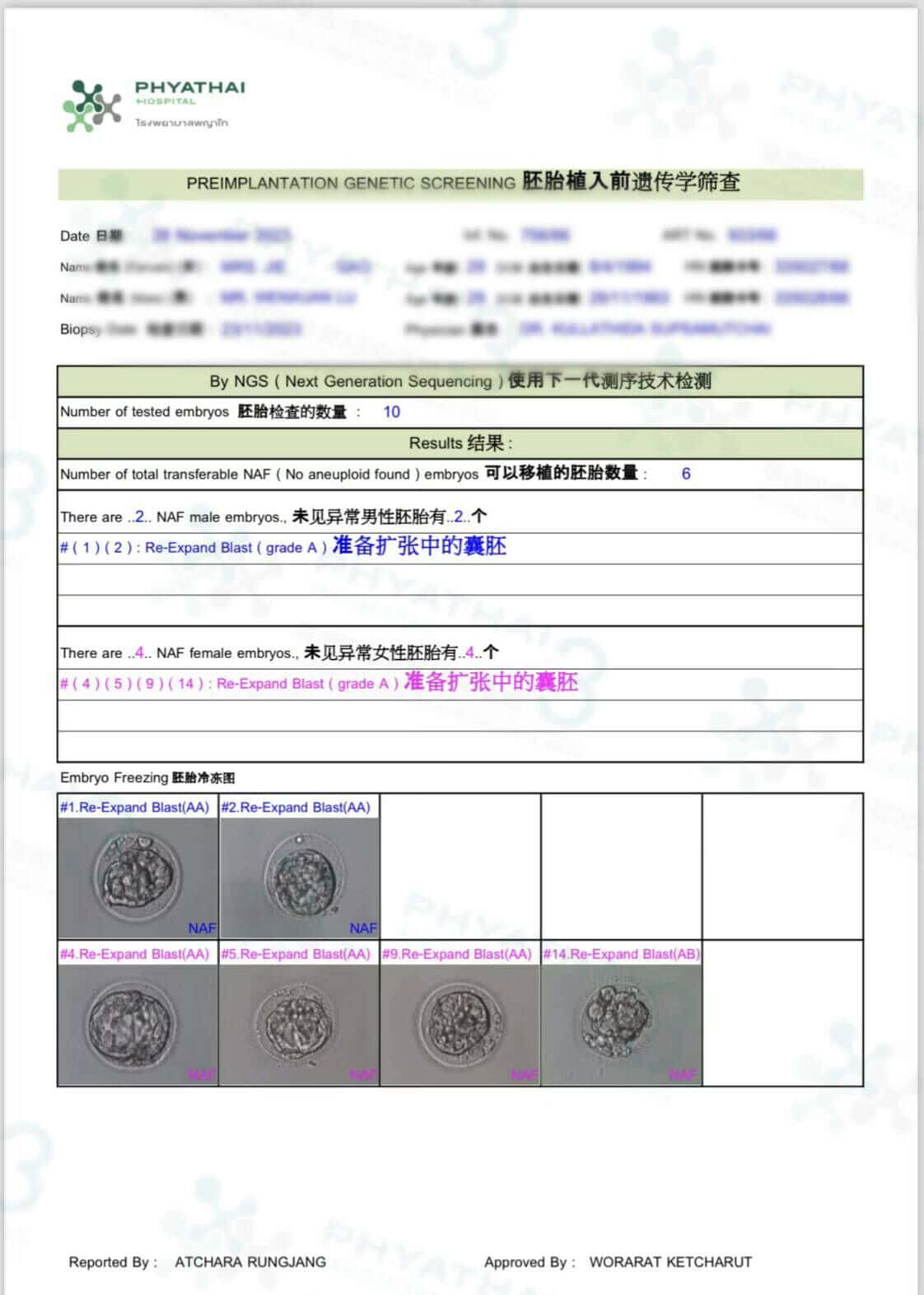 患者表示,等待染色体结果的时刻是最激动人心的时刻。今天,结果终于出来了。患者有2个蓝胚胎和4个粉胚胎健康可以移植,最重要的是,胚胎的等级非常好,都是A级。患者非常高兴,因为这次是第一做试管就有怎么好的结果。所以,谁想要有好的结果,就应该从一开始就选择好的医院。成功会来得更快。再次恭喜恭喜,从现在开始就准备好滋养身体,等待迎接宝宝啦。