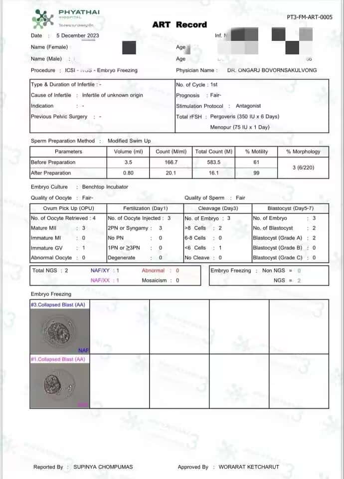 AMH1.07 送2得2健康胚胎! 31岁早衰小姐姐过半年AMH下降了一半,取卵子出来只有4枚。最后养到成AA等级囊胚2枚送筛染色体检查,没想到结果出来,我们2枚胚胎全部健康,一蓝一粉,太好了太好了!接下来等您们回来移植了哈。