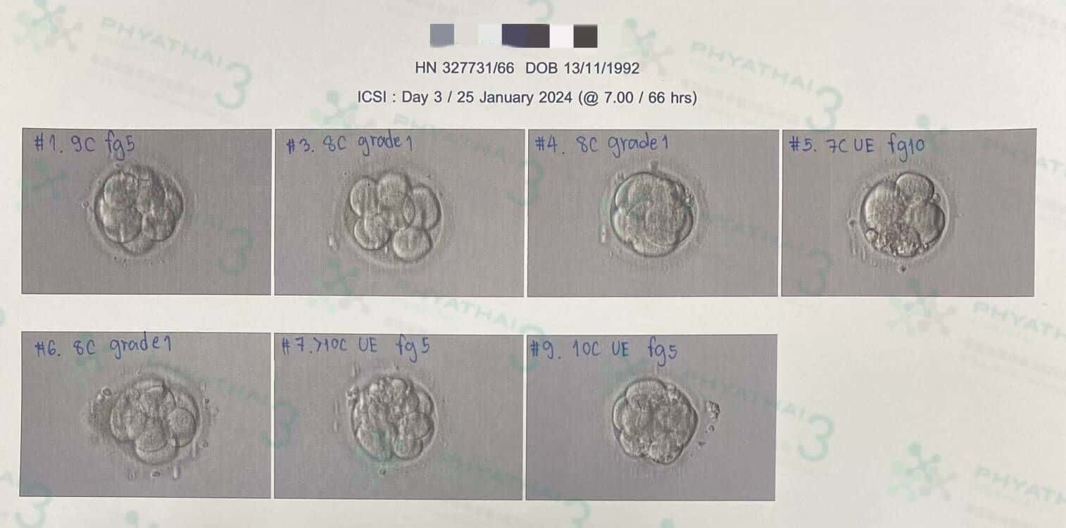 超级可爱的家庭,心态好好的小姐姐,两位去年9 月份就来过泰国游玩了,小姐姐说很喜欢这边,这一次来促排也比较熟悉了。促排之路很是顺利,今天也到了养囊第五天,7 枚养成了 6 枚囊胚,另外一枚也还在发育中,成囊的级别也很好噢,超棒!小姐姐已经开始期待染色体筛查结果啦,希望顺顺利利,宝宝快来呀