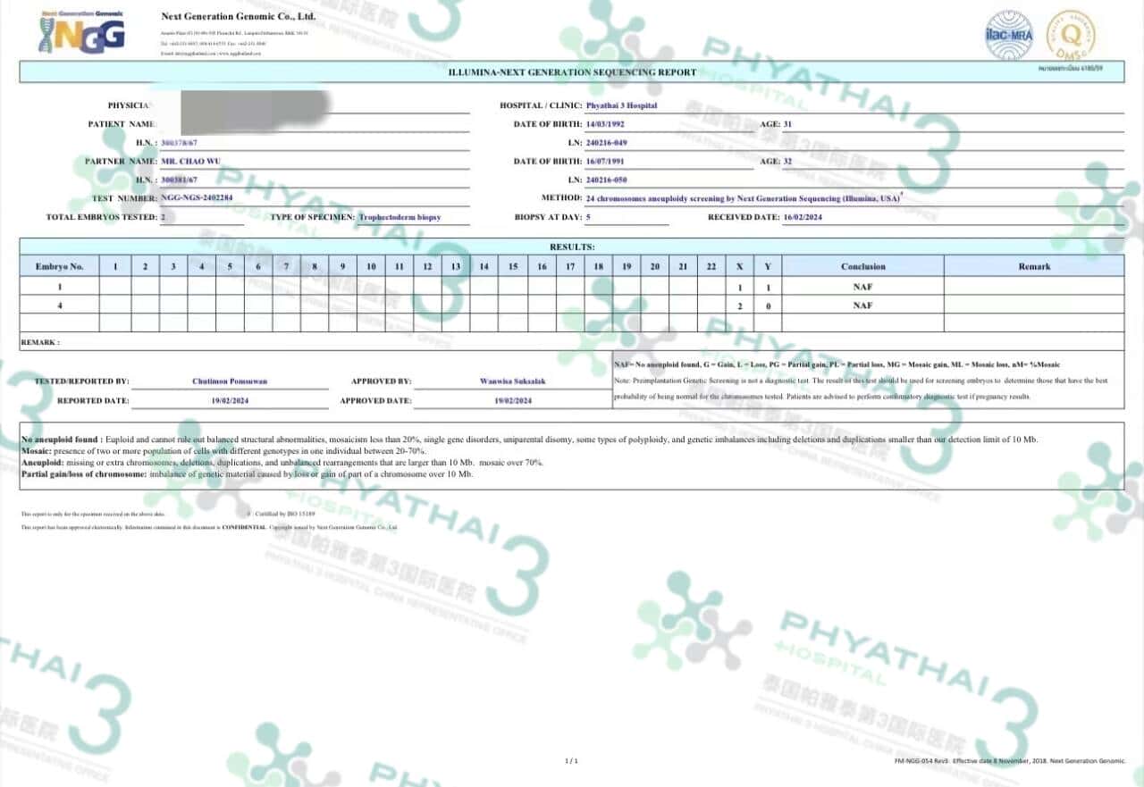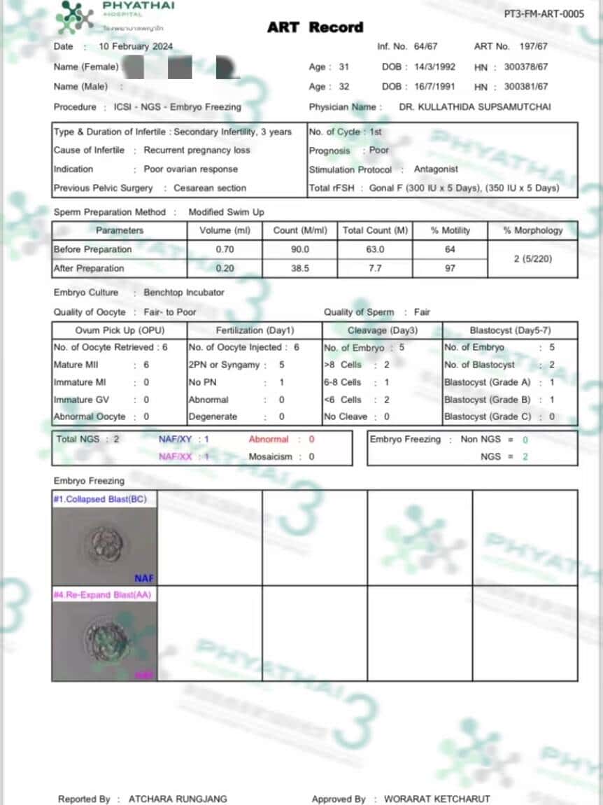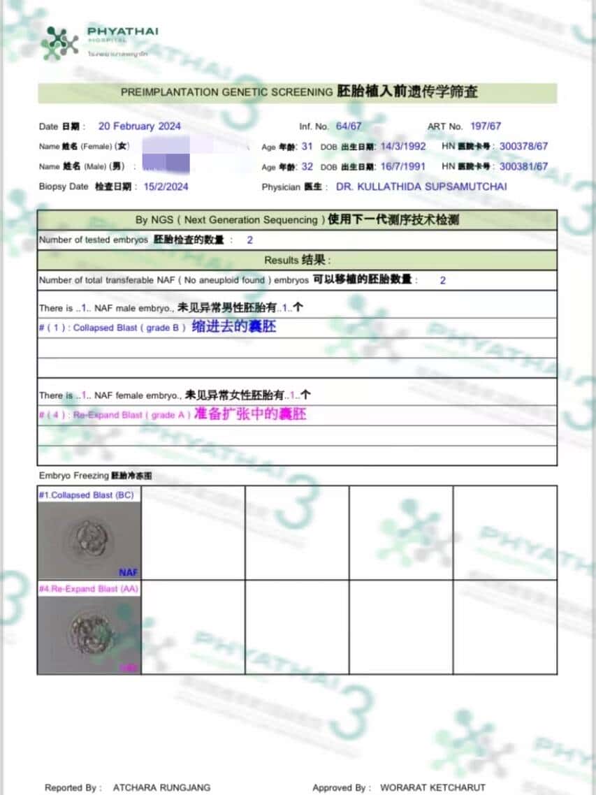 女士说她先哭一下再激动,哈哈哈 好开心呀 促排时候因女士身体过于虚弱 取卵当天女士说她并没有抱什么希望 结果取到了6枚 全部受精成功最后成囊2枚 送筛查染色体2枚都健康1蓝1粉真的太棒啦 希望移植也是顺顺利利呀