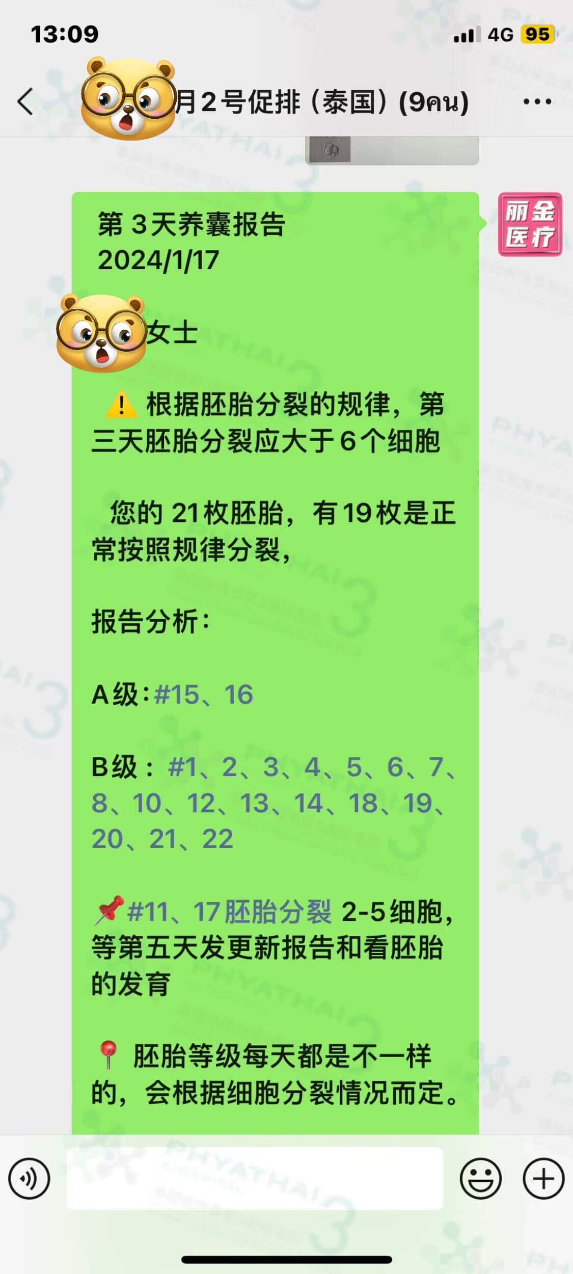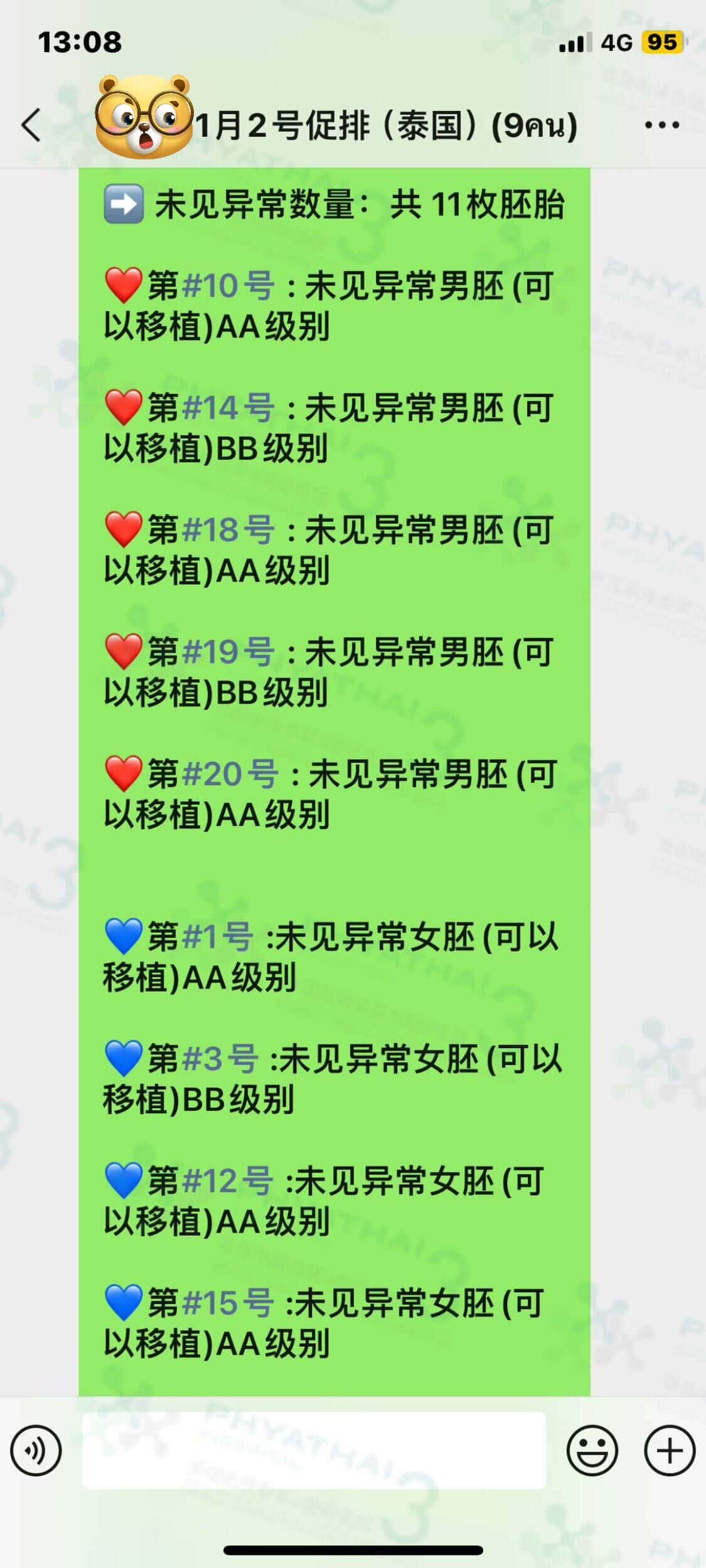 年龄大也会有自己孩子的机会的 ,这个家庭是长期在泰国,患者年龄已经35岁了就被认为开始变老了。尽管患者年纪大了,但治疗效果仍然和年轻人一样好。今天染色体结果出来了。总共送检13个胚胎,其中有11个胚胎正常蓝、粉都有。重要的是胚胎等级非常好。只有A和B级别。 患者非常高兴,因为结果已经超出自己的预估了,他们对选择在帕3医院接受治疗一点也不失望过 。 我们再次恭喜恭喜 现在龙宝宝们都在准备等待妈妈来接他们回家哦。这段时间可以慢慢调理身体准备好了再过来移植哦。