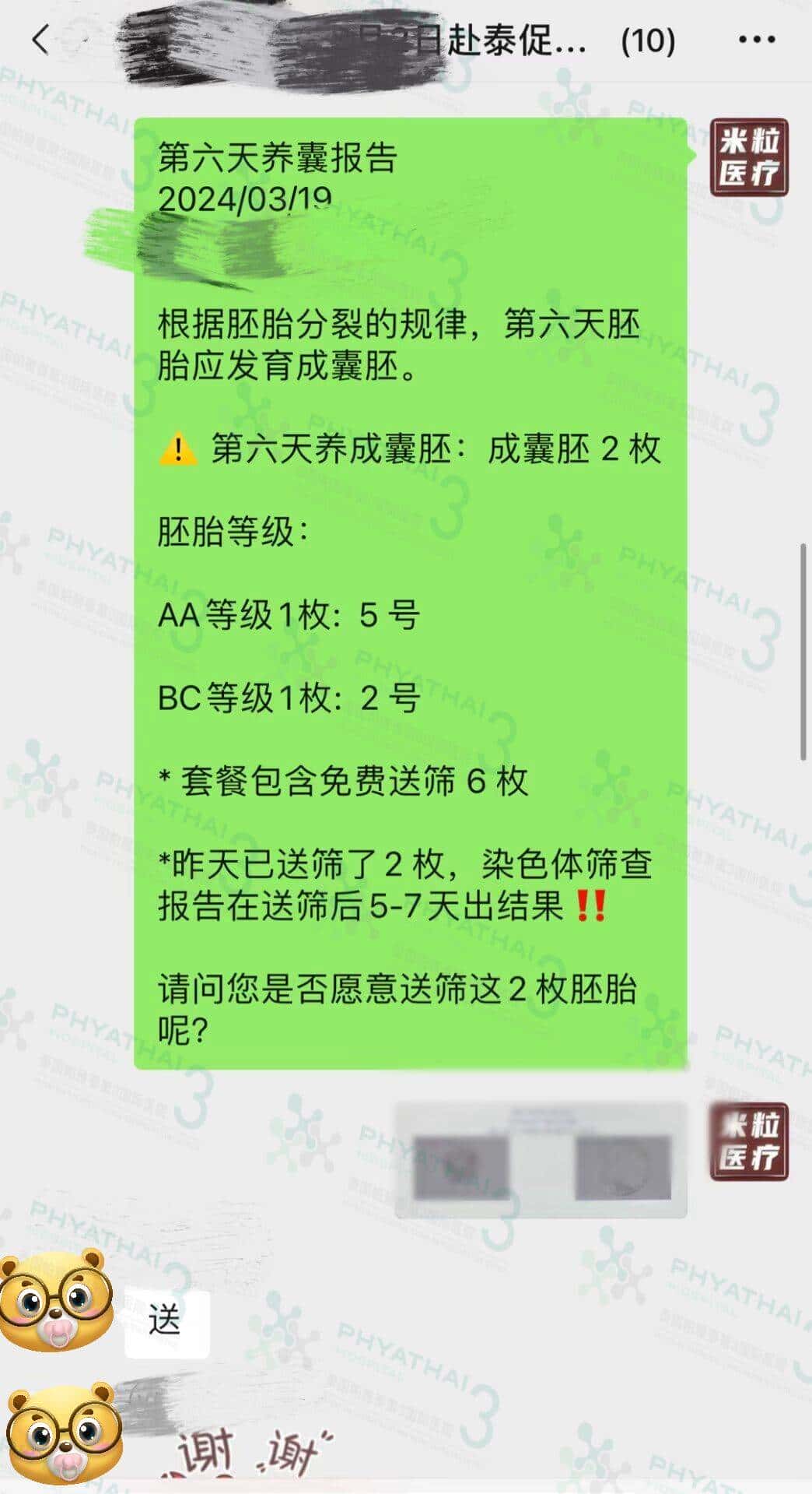 今天两个小姐姐第六天养囊报告出来啦,小姐姐们是同一天取卵,再第六天都养成囊胚啦 而且都是A、B 级别噢 小姐姐说实验是太棒啦 养囊率百分百,小姐姐们决定都送筛 5-7天后出筛查结果,祝筛查也顺利通过 一路绿灯~