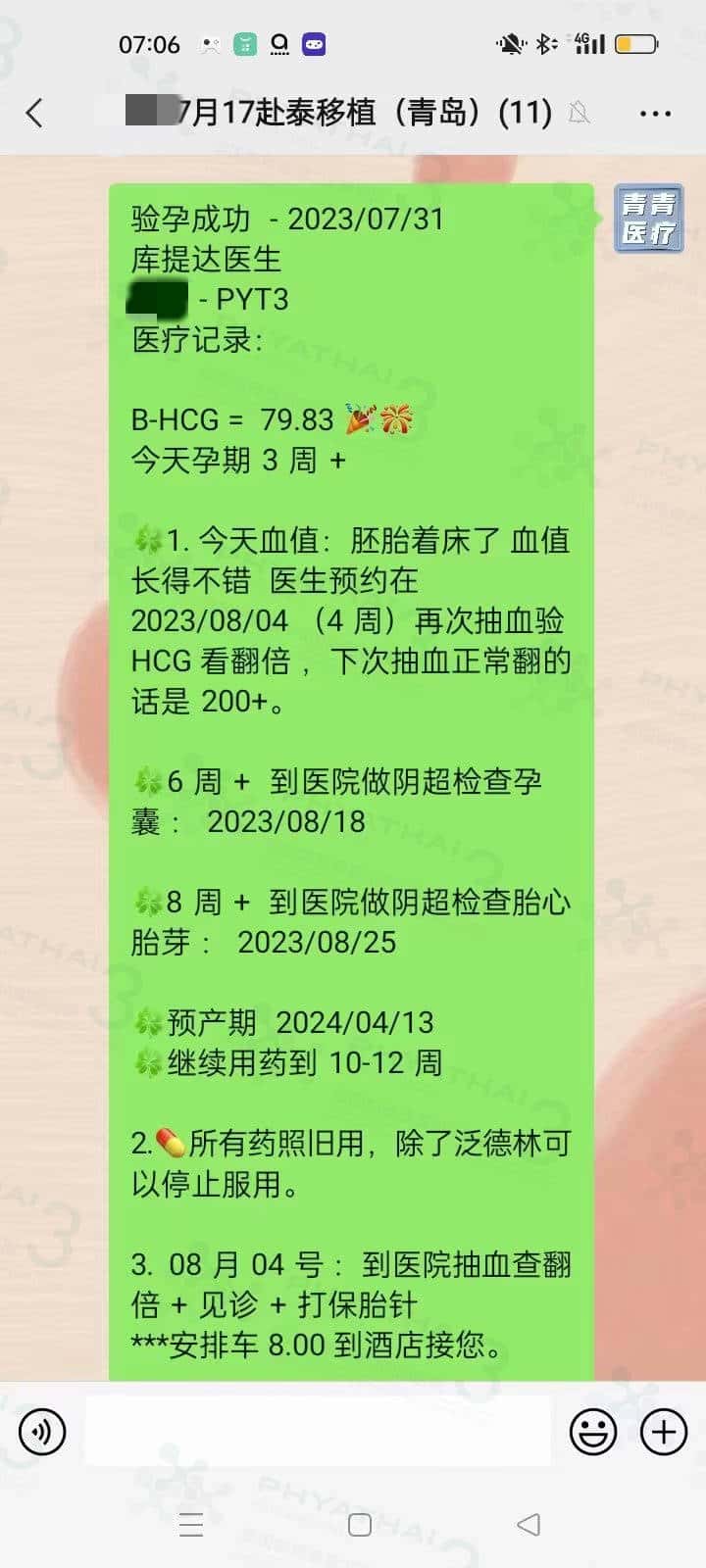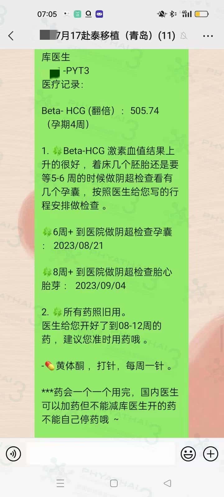 又是很紧张的一关 抽血验孕成功之后还要查翻倍看血值有没有翻倍 女士先生一早就到医院抽血下午就回国了 结果出来翻倍美美的 505 就要看六周的时候有几个孕囊了 希望两个宝宝都好好着床成长 回国继续用药 顺顺利利