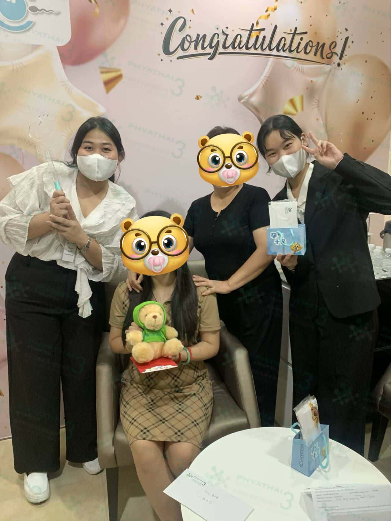 姐妹们你好,我们女士今天验孕成功啦 ,这次我们女士有我和慈萍当女士的翻译 ,我是生活翻译,慈萍是医疗翻译,女士是5月24号来泰国做促排的,我们女士是个很可爱的人,来到泰国了有一天女士去医院见诊,女士就问慈萍了思远在哪儿里呢?为什么这几天没看到思远呢?,慈萍就说思远是生病了,所以没来工作,女士就在群里每天问我,思远你好点了吗?,思远今天感觉怎么样?,思远多喝热水哈,好贴心呀,真的很可爱,取卵完了之后女士就回国啦,7月27号两个月之后女士就飞到泰国来移植了,移植后我们等了好几天就要验孕了哦,那天女士早上8.30就到医院抽血检查一下,等了一个半小时结果就出来啦,我们女士成功了,可以带着宝宝一起回国啦,女士说;因为我们医院的小熊很可爱,所以吸引了女士来我们医院做试管的,终于有了自己的小熊了,好开心,我们听女士这么说都是很开心,我们祝女士和宝宝,健健康康,平平安安,顺顺利利的哈