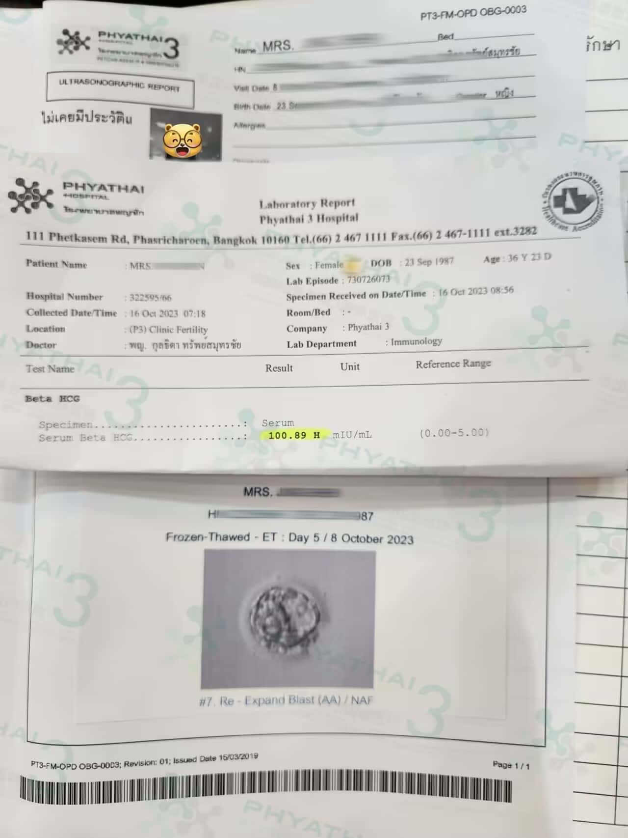 一次好孕回国啦~ 又是开奖的一天 女士前天来打保胎针的时候就已经自己验出来了 今天抽血确认血值100+ 真的好好的血值 ~ 从促排到移植女士一直都是很可爱很可爱的 每次见诊真的是很配合医生的方案 一路都很顺利 验孕成功带着好孕小熊回去啰 后面也是顺顺利利