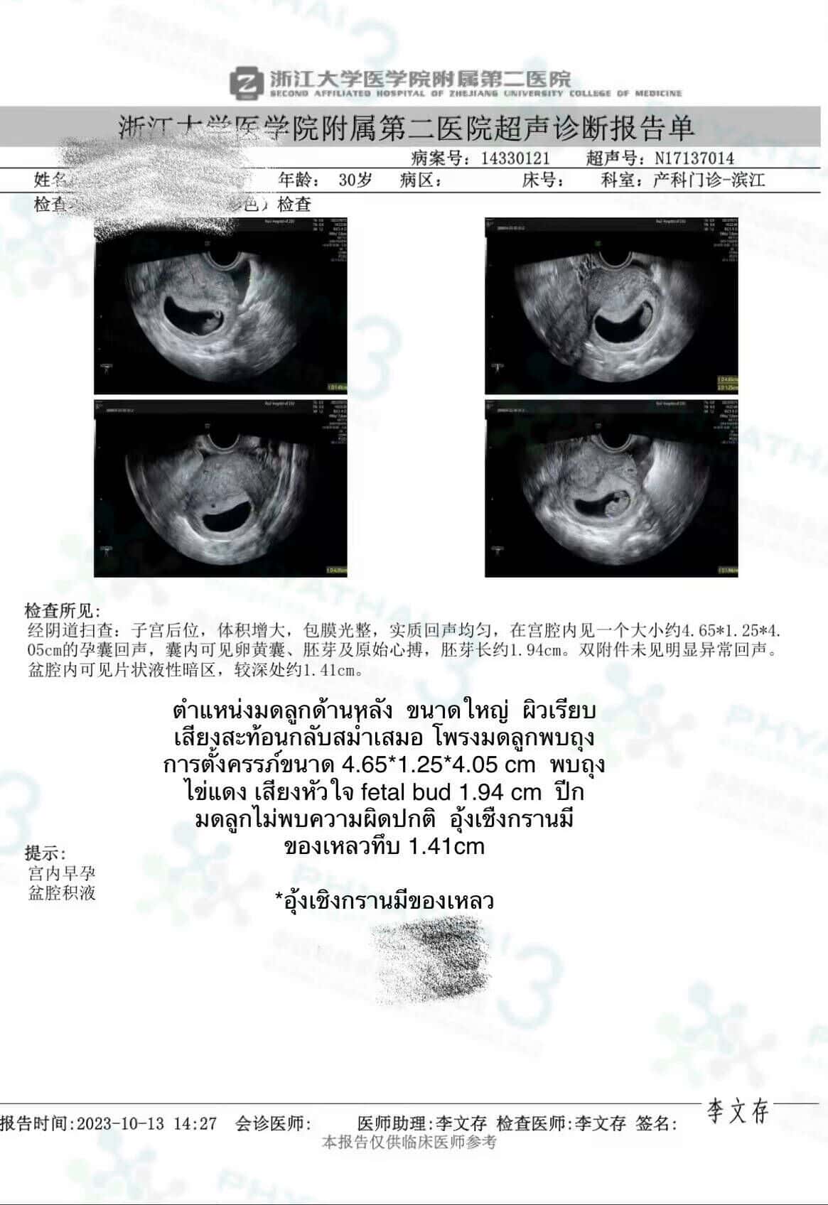 今天患者发孕囊,胎心胎芽和NT的结果来跟医生报道。 尽管治疗所有不孕症患者是我们的责任。尽管患者怀孕之后并且已经回国了,每一位医生和医疗团队时刻关心着每一位患者。每次患者向我们发送更新报告时。每个人都为每一位患者感到高兴和兴奋。移植胚胎时,医生将胚胎移植到了一个好的位置,导致胚胎生长良好。现在认为怀孕的第一阶段已经过关了。我们希望未来永远都这样一切顺利,平安到生噢。