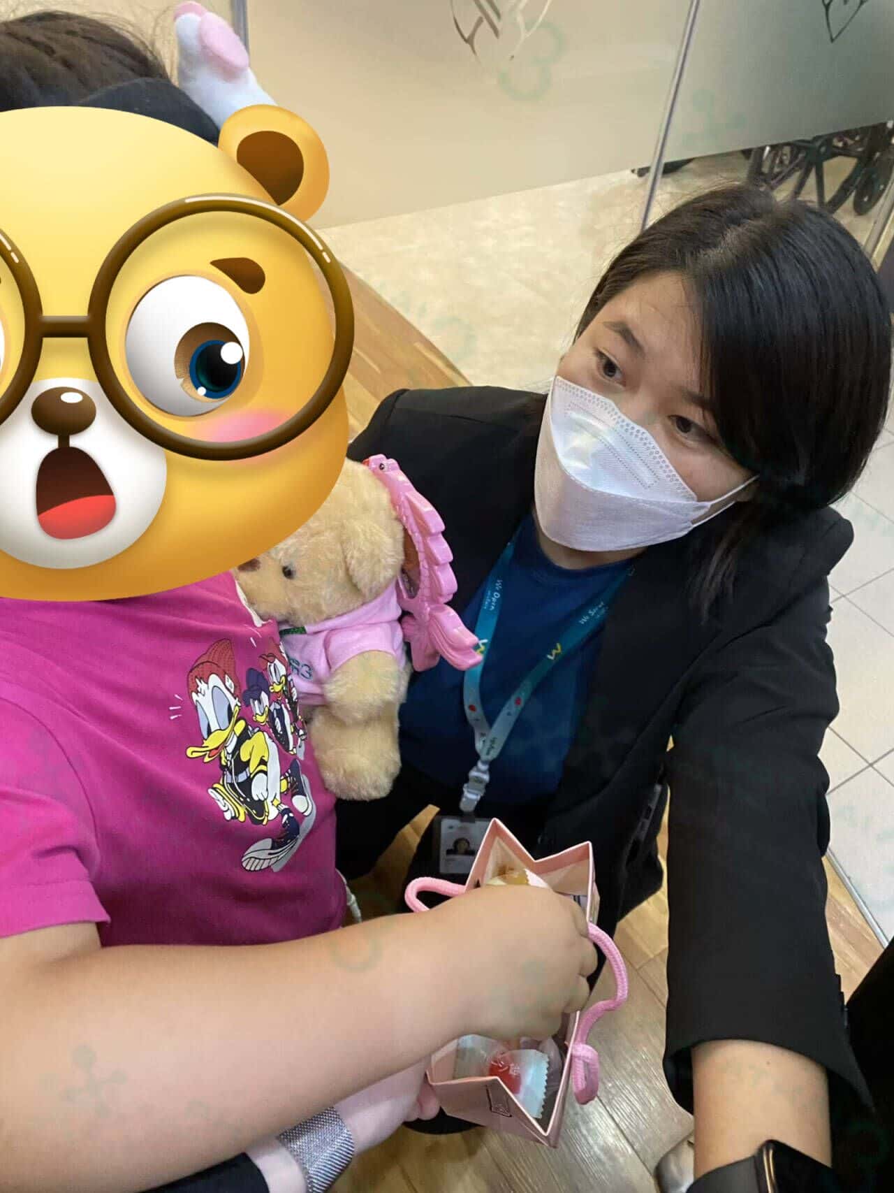 今天早上患者来跟医生见诊,正巧有另外一个家庭验孕成功,所以我们就准备了小熊和喜糖为了准备送给患者。患者的女儿一看到就马上出来抱抱小熊想拿着回家。 女儿很可爱,还给妈妈带了一些喜糖。它将带来顺利和好孕。再等一会儿,妈妈也会像这样进行验孕成功就成为一个姐姐了。看他这么照顾、抱着小熊绝对是个好姐姐。妈妈,你必须为了小王子坚持加油。我们将一起带小王子回家噢。