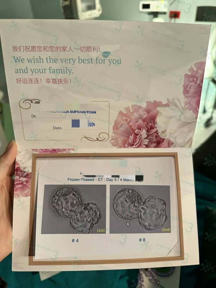 这对小王子和小公主实在是太棒了,两个大花生孵化的好好呀,女士说看着就很喜欢哈哈哈。今天一早来验孕啦,问女士有没有偷偷自测,女士说不敢测还是直接抽血比较好,血值一出女士激动开心的满脸通红,太好了!这次女士来移植还带了手办给翻译和医生,是龙吊坠噢,很有心。而女士自己也有属于自己的龙宝宝啦,回国查翻倍也很是顺利,后期也要顺顺利利的呀