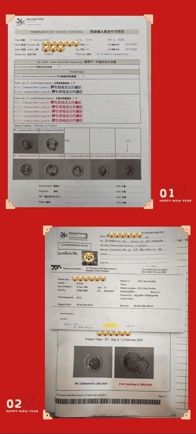 最后这位31岁的姐妹,主要是奔着生龙凤胎来的,想一次儿女双全,医生也是仔细检查评估后,给这位期待龙凤的宝妈移植,最后真的就实现了这个心愿,可喜可贺,这位姐妹在我院送筛11枚,筛查后有2个健康男胚,5个健康女胚,共是有7配健康的胚胎可以移植,这位姐妹知道结果后还开玩笑说,可以移植个篮球队了,姐妹心态可真是棒呢,最终姐妹手是移植的一枚AB级男胚,一枚BB级女胚,2月9日成功好孕龙凤胎!