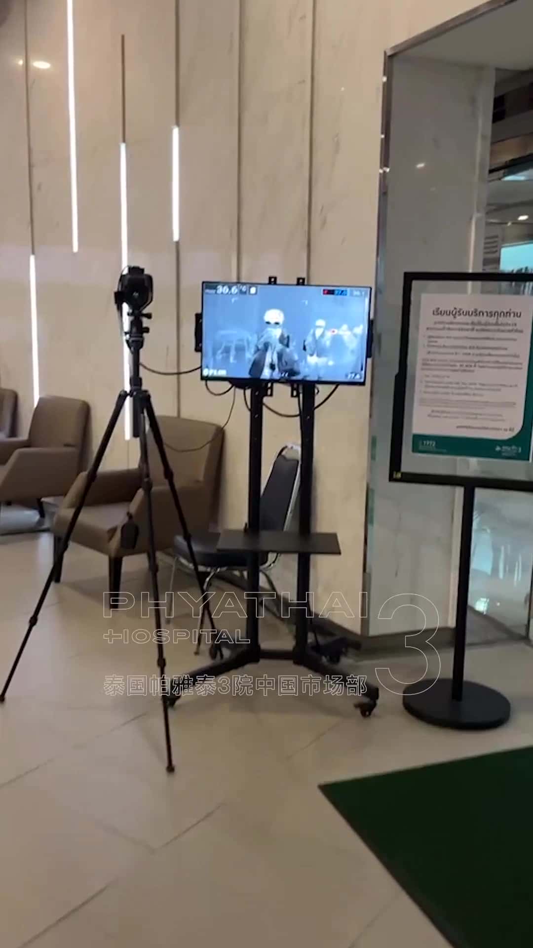 上次给大家分享从我们泰国试管医院的停车场进医院的量体温门,今天分享从泰国试管医院大门前面进去前有一个屏幕和摄像头量体温,这会在屏幕上显示体温。
