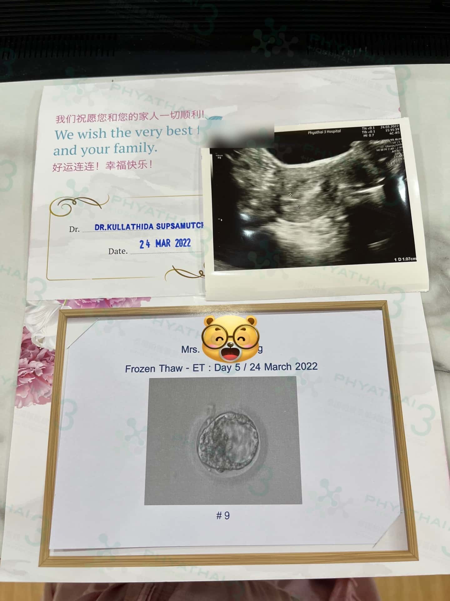 今天我的试管患者移植胚胎9号,这是很吉祥的数字,今天很荣幸陪试管患者欢迎宝宝到母体,很感动,我相信他会顺顺利利的发育!