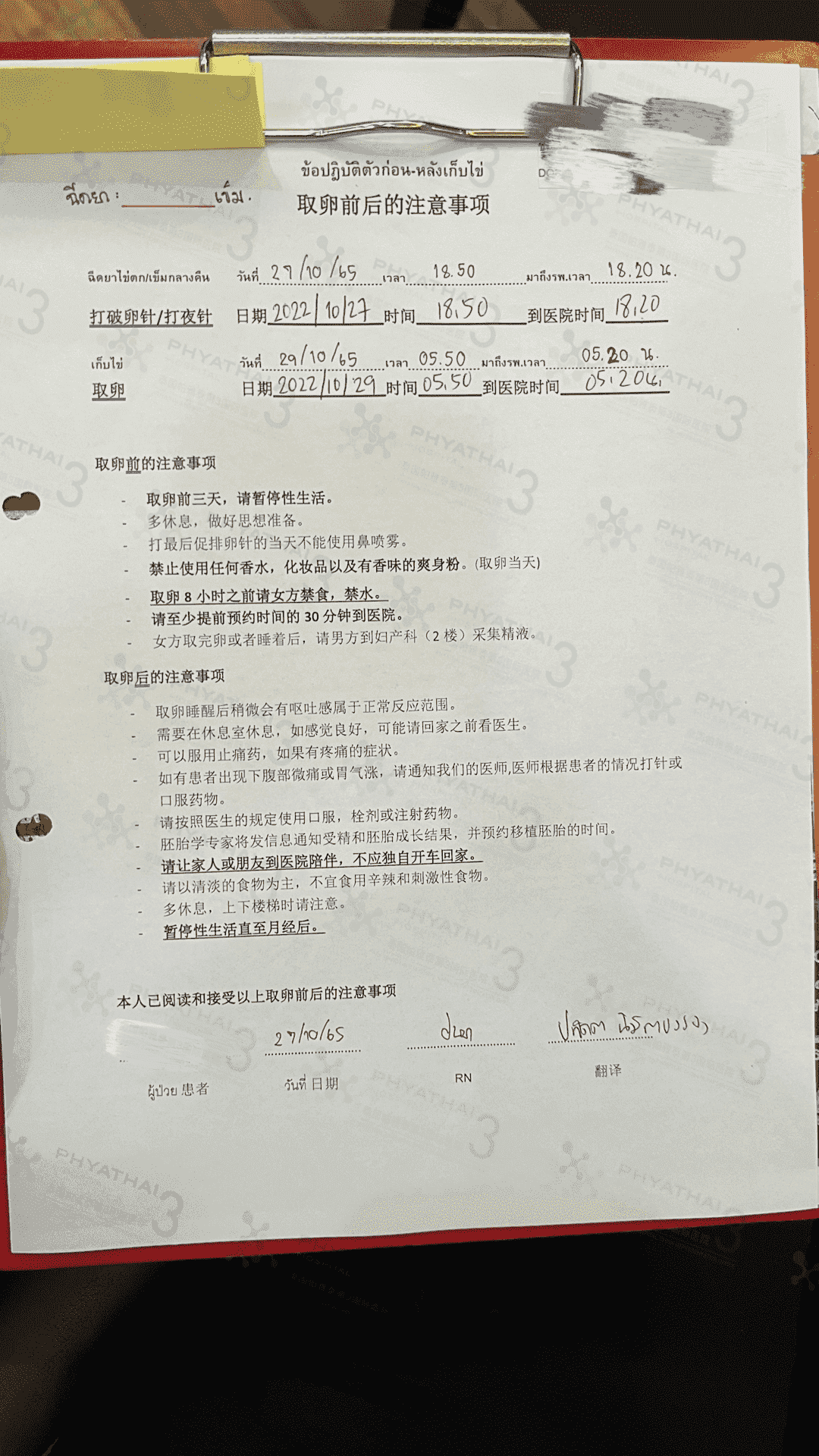 今天是我漂亮的患者最后一天打针那就是夜针啦,她非常开心终于不要再打针啦,也可以马上回国了,医生评估取到10枚左右卵子,女士心态特别好,只希望有1-2个可移植的胚胎就行,明天在酒店休息,后天早上很早5点半就要做取卵手术,医生说手术当天起床刷牙就来医院,到医院注射麻药后继续睡,女士一听医生的手术流程都不紧张了,库医生和患者都很可爱期待取卵受精后的健康囊胚