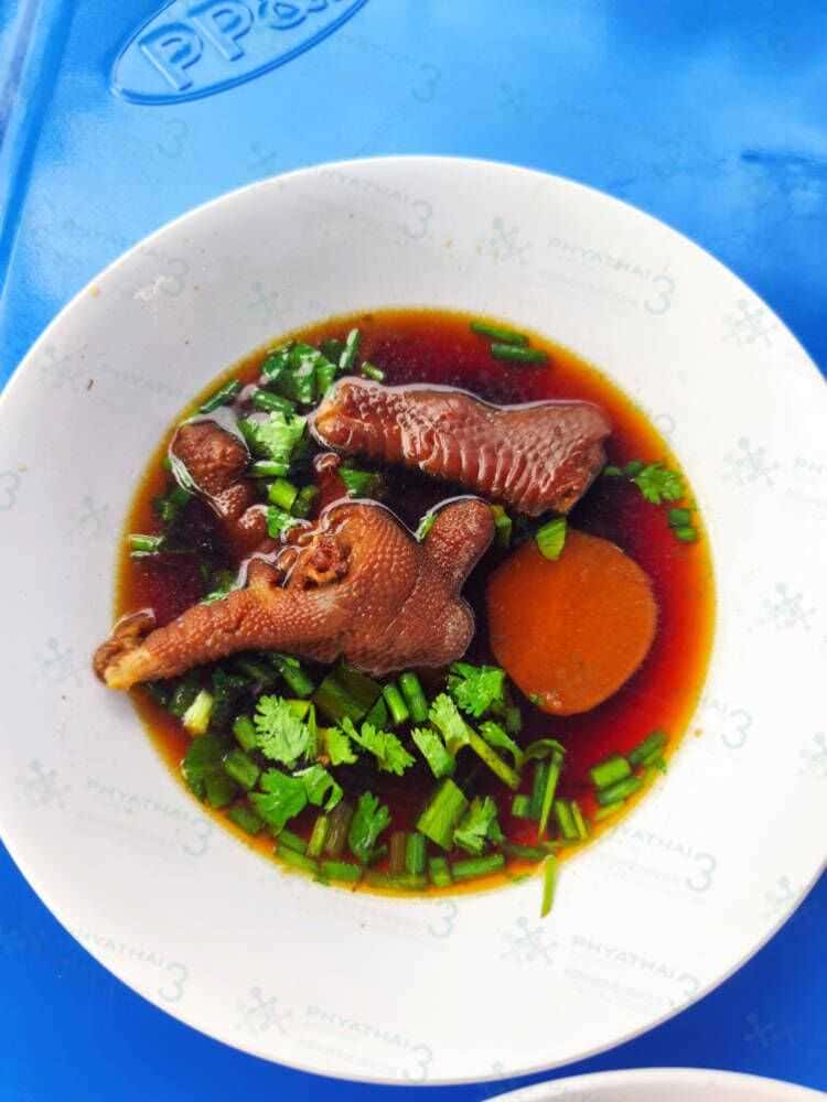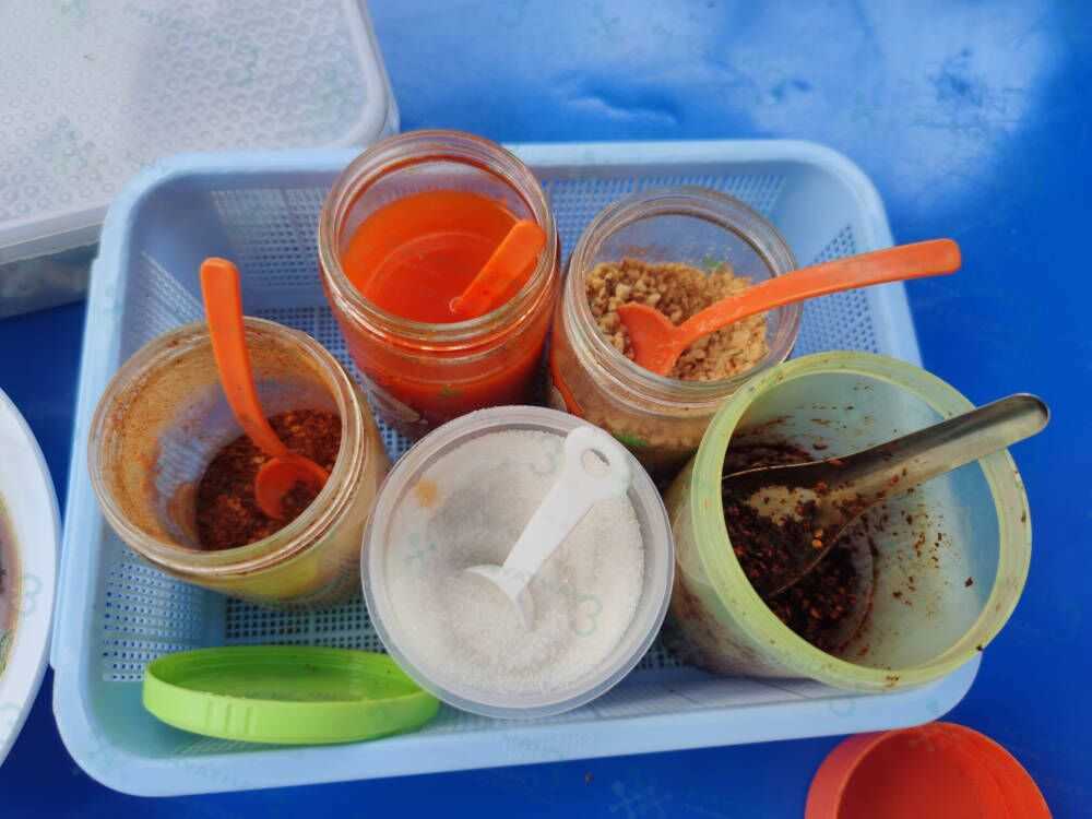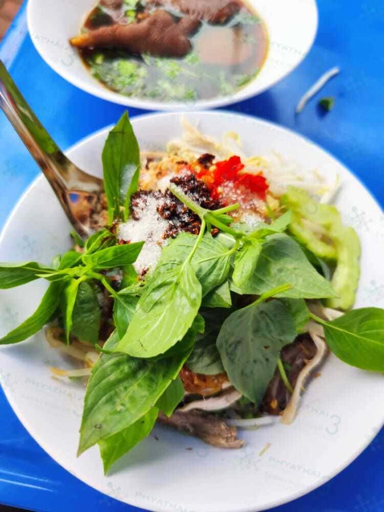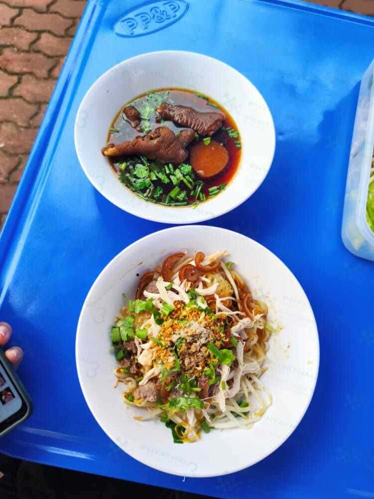 来泰国必尝的美食之~~ 鸡肉面特制秘方的苦瓜熬煮鸡肉汤底 ~ 配上按照个人喜好选择的面条类别~ 加上跟汤底一起熬煮香软有嚼劲的鸡肉丝~ 再配上我们的苦瓜,豆芽,还有泰国特别喜欢吃的配料~ 拥有独特口味的金不换叶~ 所谓众口难调最佳方案就是自己调味~ 店主提供了一大堆配料里面有 碎花生,白糖,干辣椒,还有香煎油辣椒以及酸辣椒酱和雨露各种配料调在一起简直是非常的 “ 完美” ~~ 并且这一碗面只需要45泰铢喔~ 有面还有肉非常的值得品尝 ~ 店面就在我们檫典酒店斜对面 ~ 试管姐妹们有空可以试一下哈~~ 避开周一喔周一不开店