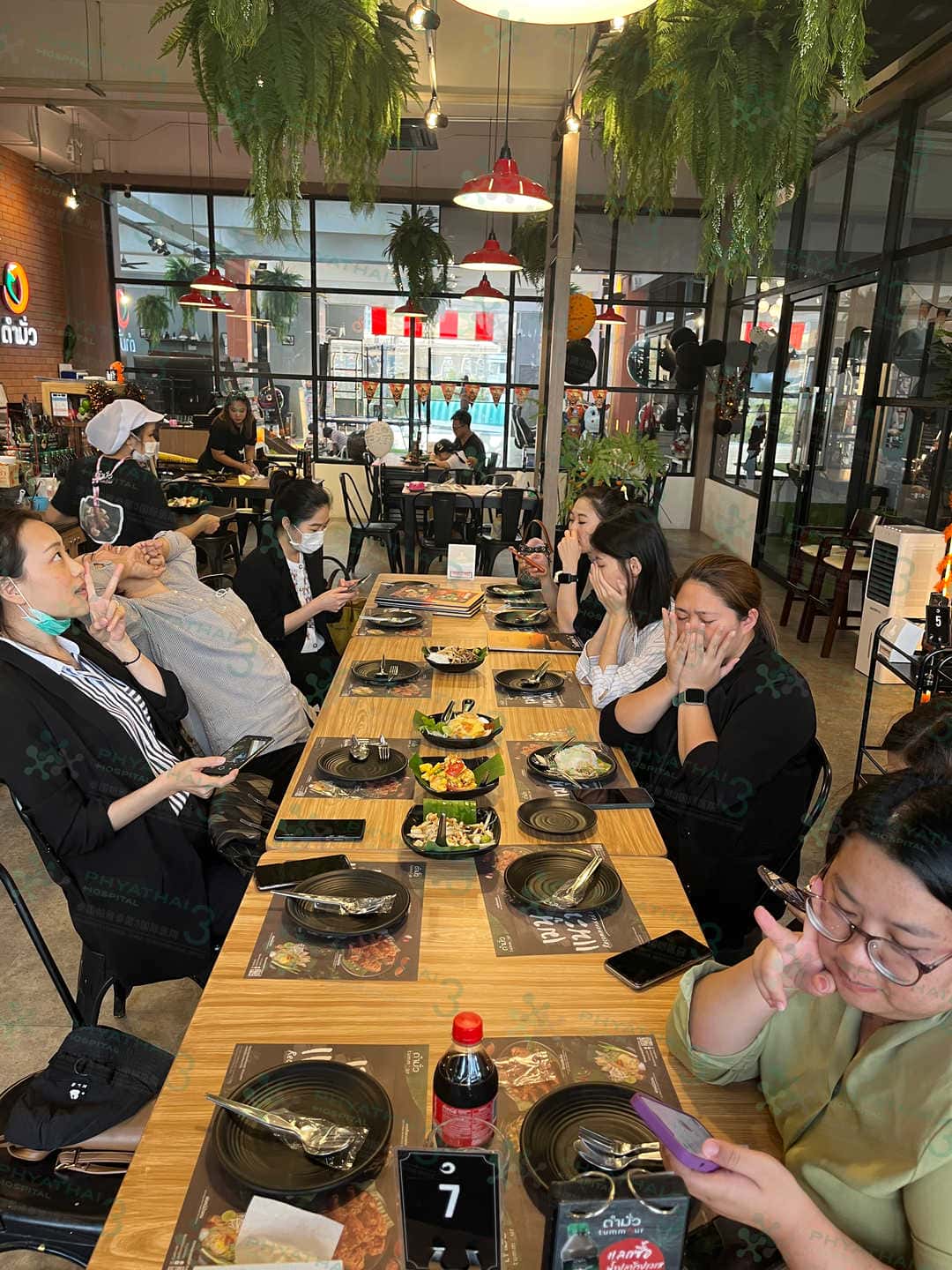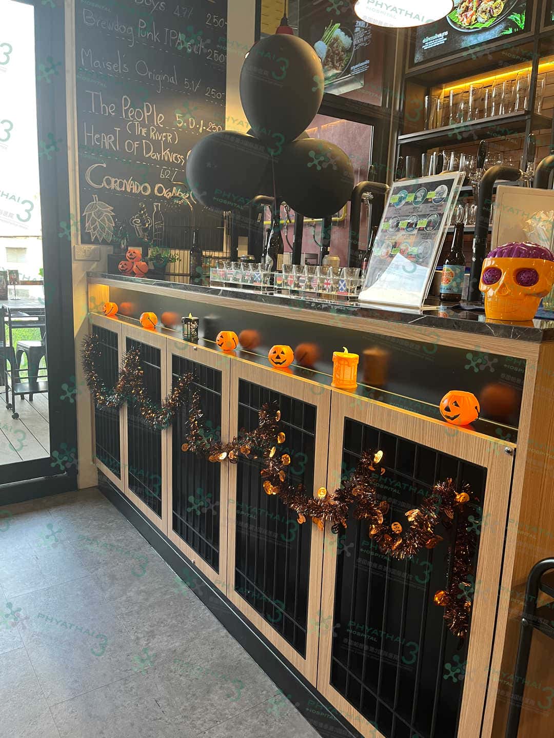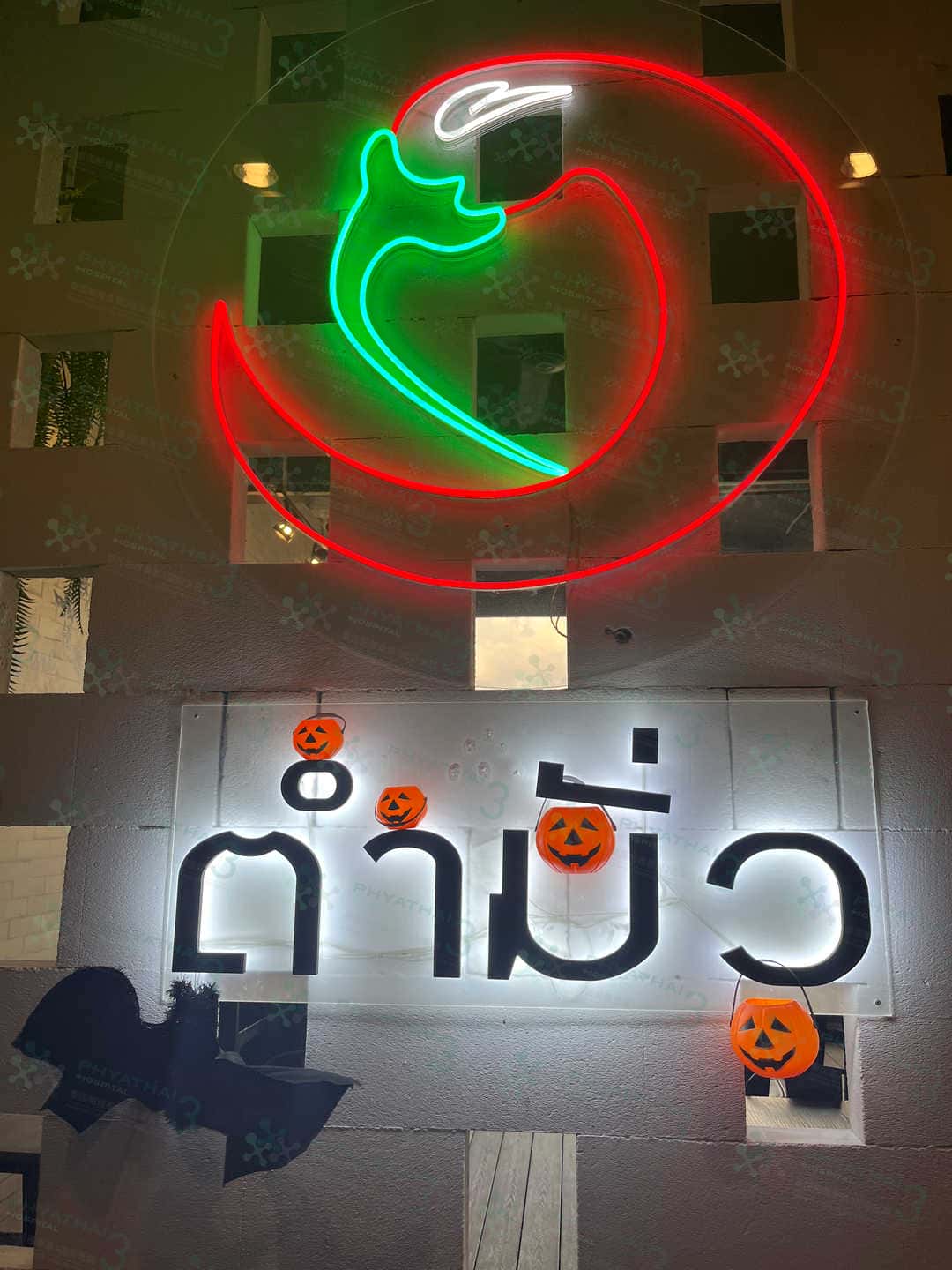 今天我们翻译团队下班了 到了我们医院前面的一个泰餐店 ตำมั่ว ~ 这个月底就是万圣节了所以店也是布置安装了万圣节的氛围