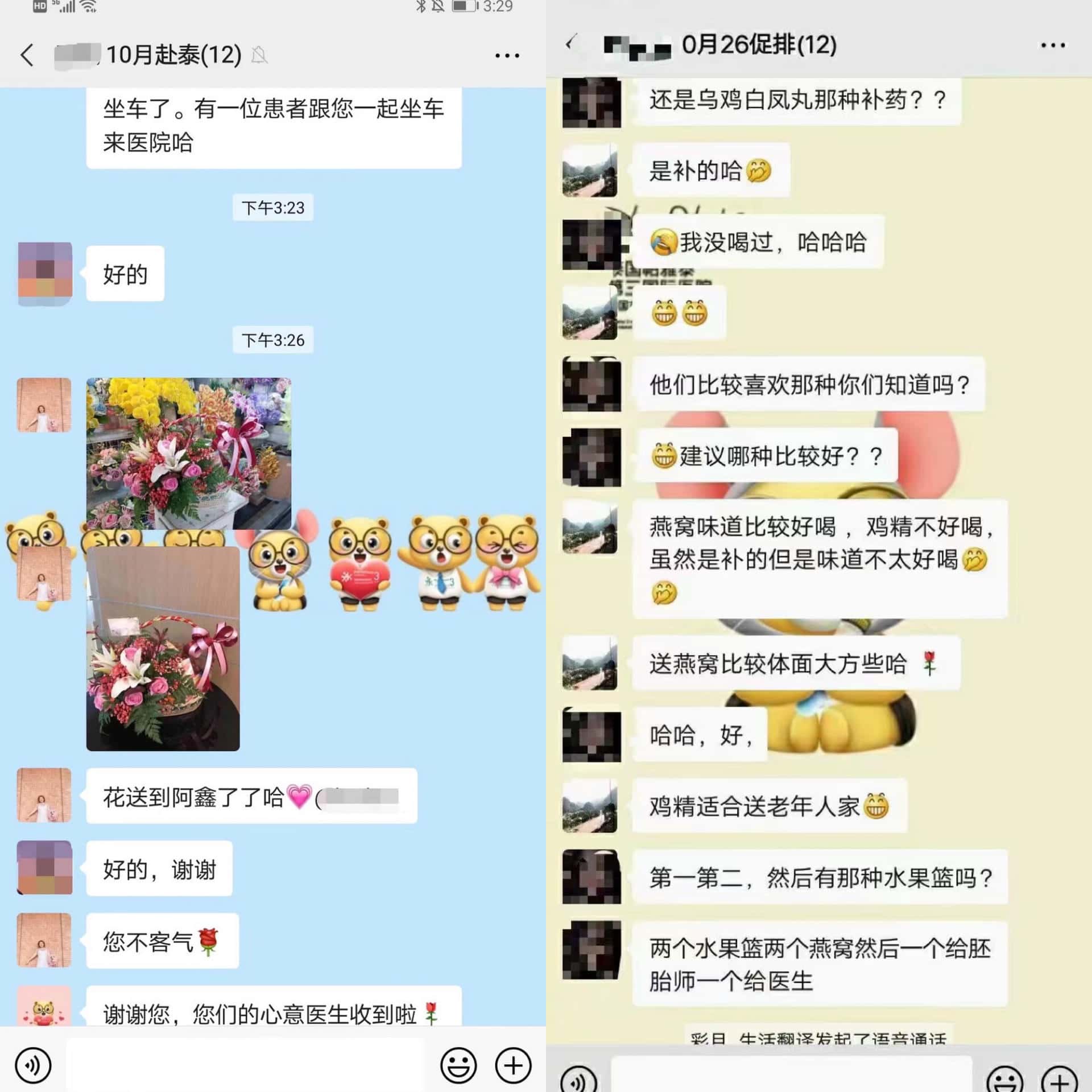 下面4张截图,分别是近日我院患者让生活翻译帮忙购买鲜花、果篮,以此感谢帕3胚胎师的记录:
